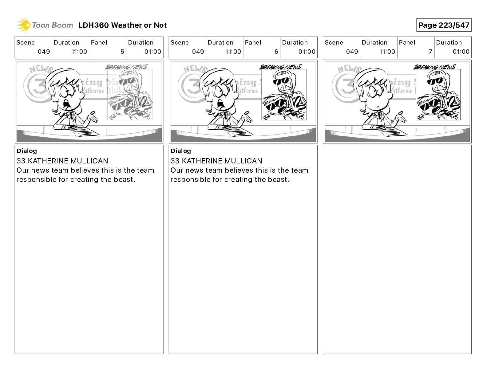 Dialog 33 KATHERINE MULLIGAN Our news team believes this is the team responsible for creating the beast. Scene 049 Duration 11 00 Panel 6 Duration 01 00 Dialog 33 KATHERINE MULLIGAN Our news team believes this is the team responsible for creating the beast. Scene 049 Duration 11 00 Panel 7 Duration 01 00 LDH360 Weather or Not Page 223/547
