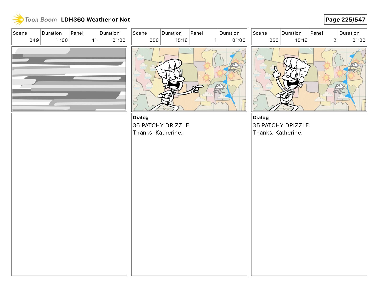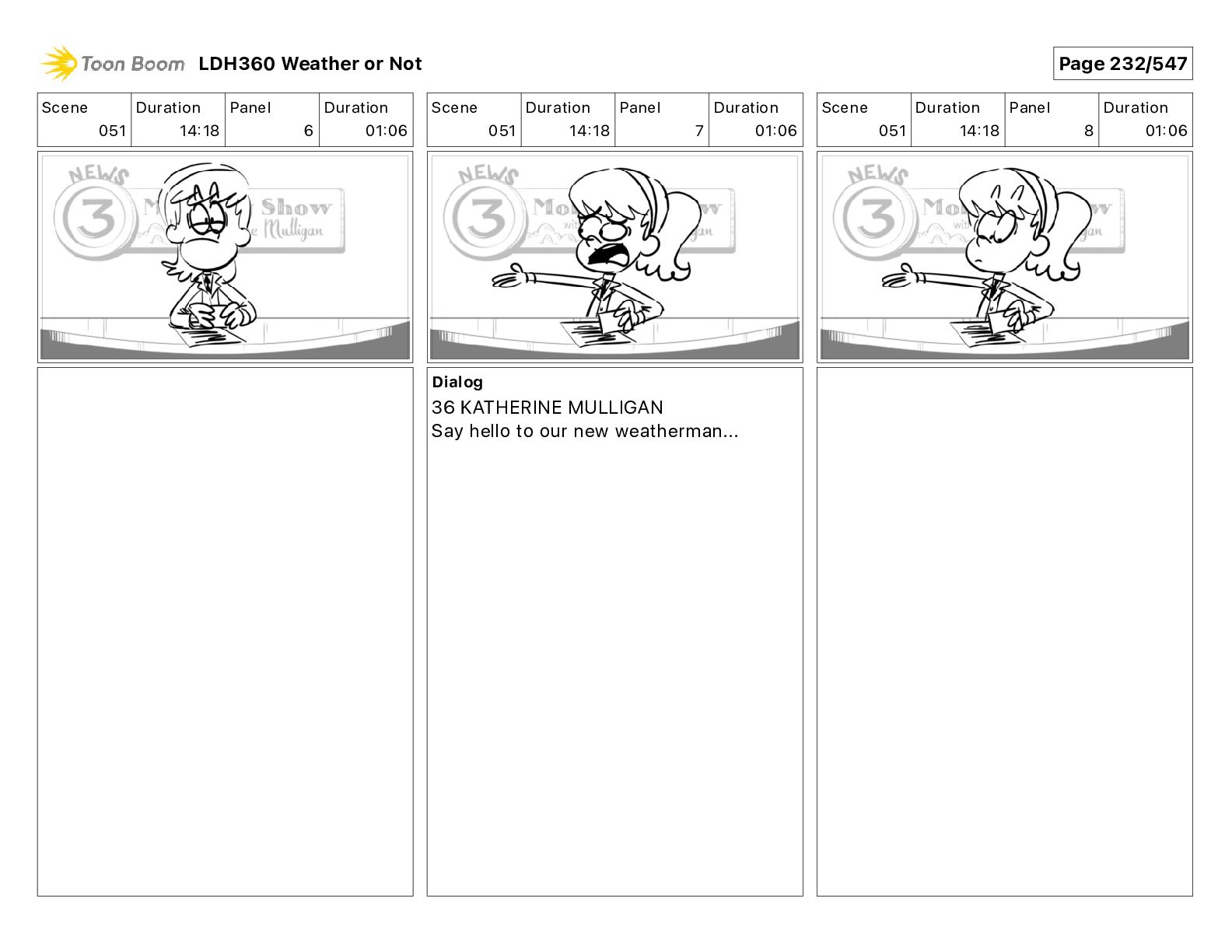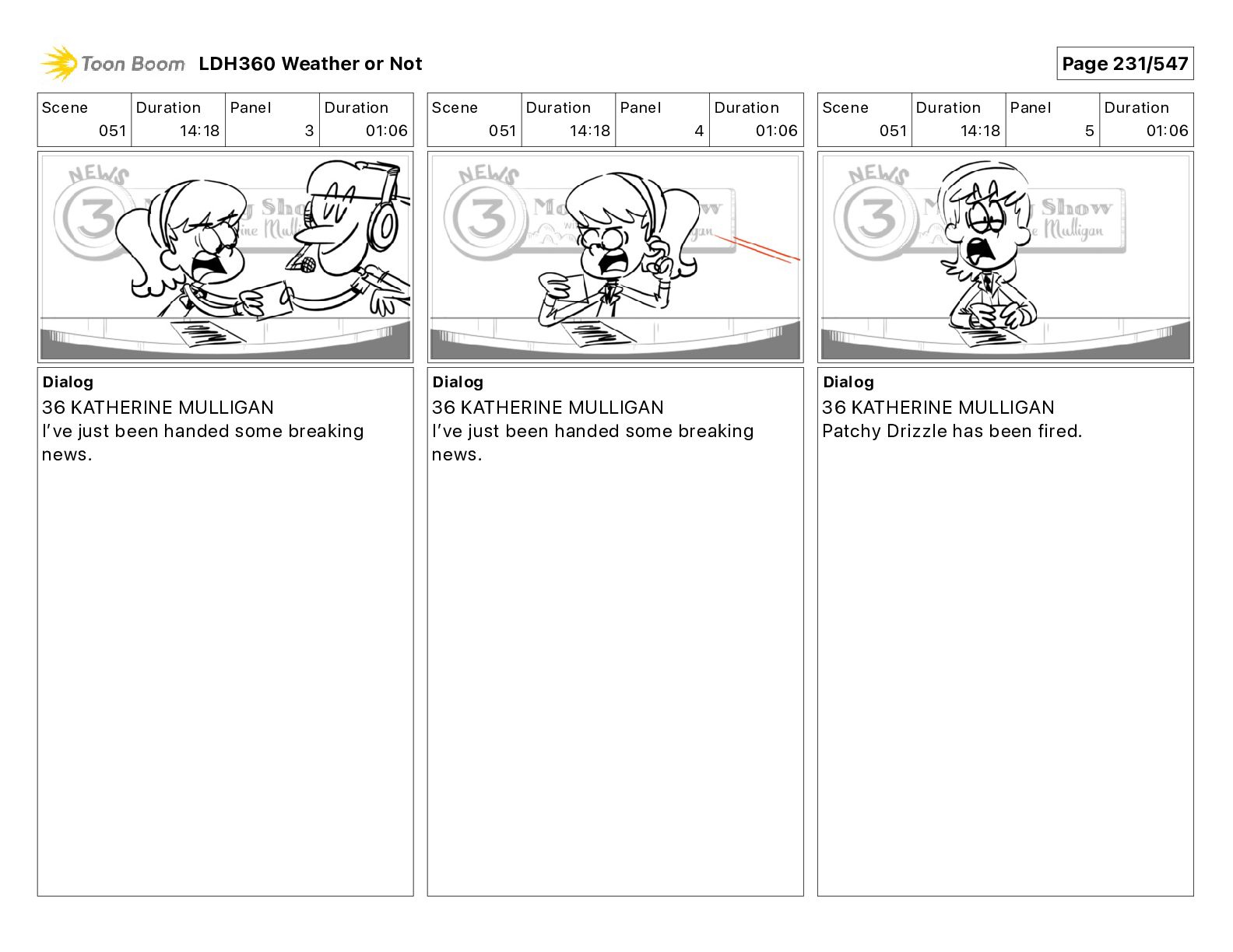 Dialog 36 KATHERINE MULLIGAN Iʼve just been handed some breaking news. Scene 051 Duration 14 18 Panel 4 Duration 01 06 Dialog 36 KATHERINE MULLIGAN Iʼve just been handed some breaking news. Scene 051 Duration 14 18 Panel 5 Duration 01 06 Dialog 36 KATHERINE MULLIGAN Patchy Drizzle has been fired. LDH360 Weather or Not Page 231/547