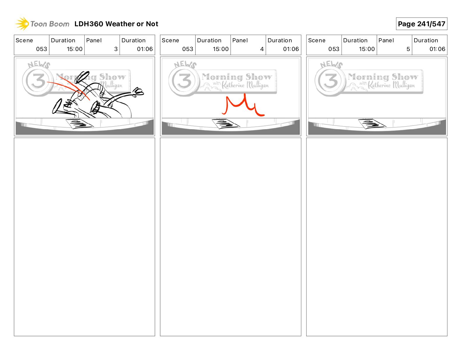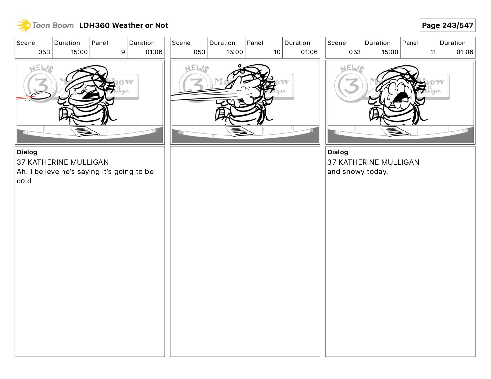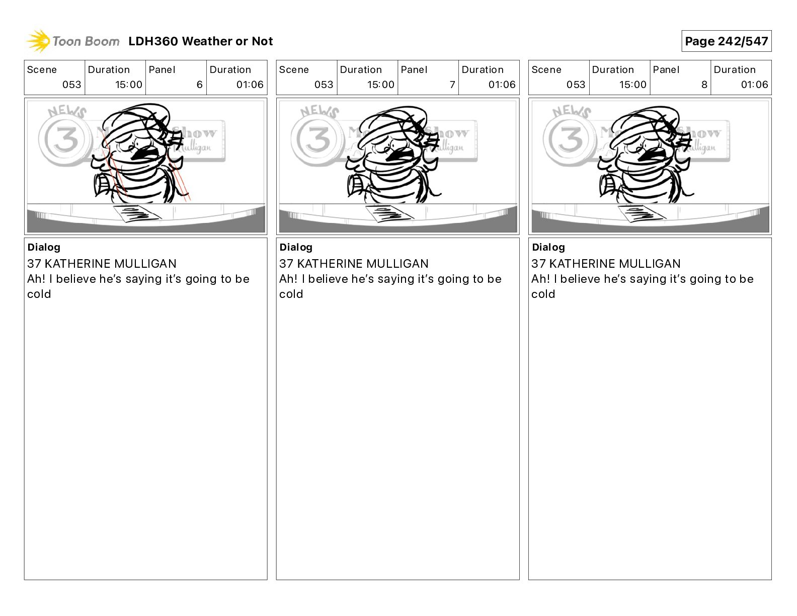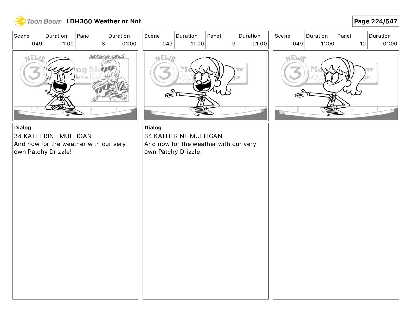 Dialog 36 KATHERINE MULLIGAN Iʼve just been handed some breaking news. Scene 051 Duration 14 18 Panel 4 Duration 01 06 Dialog 36 KATHERINE MULLIGAN Iʼve just been handed some breaking news. Scene 051 Duration 14 18 Panel 5 Duration 01 06 Dialog 36 KATHERINE MULLIGAN Patchy Drizzle has been fired. LDH360 Weather or Not Page 231/547