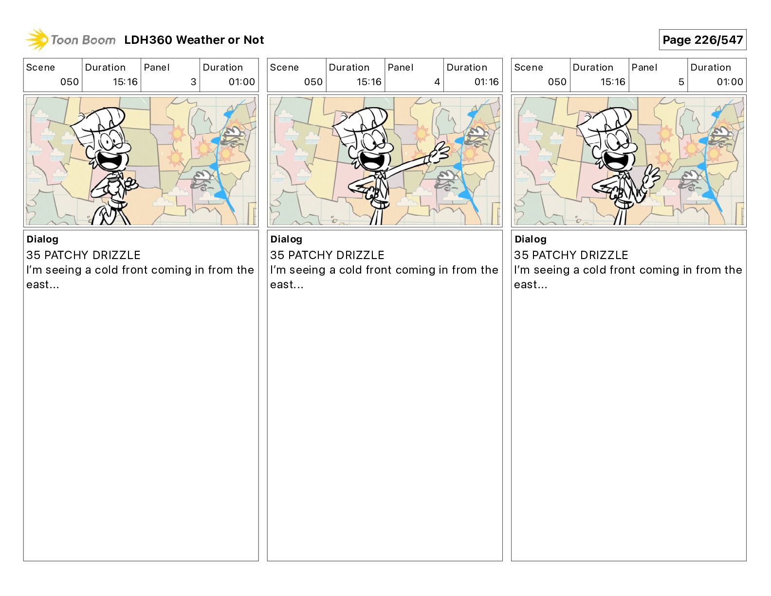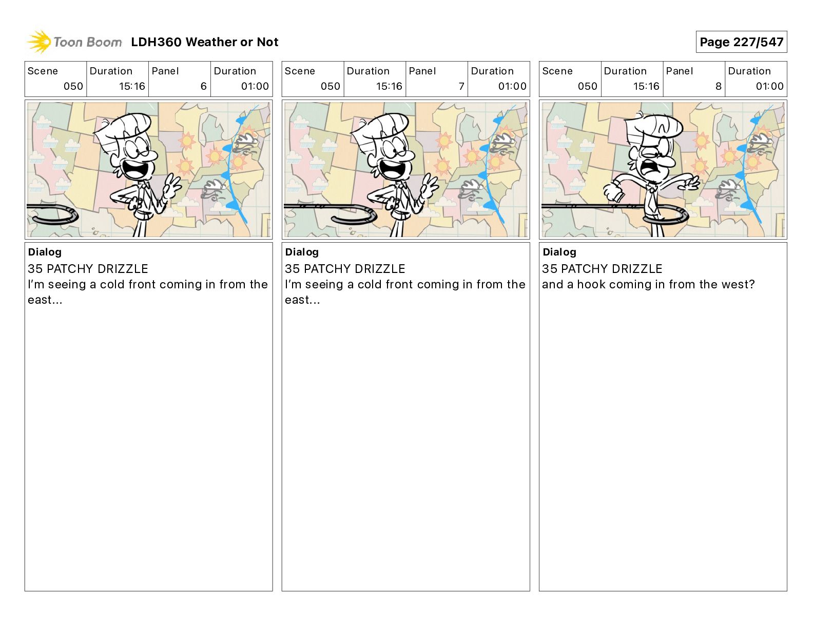 Dialog 35 PATCHY DRIZZLE Iʼm seeing a cold front coming in from the east... Scene 050 Duration 15 16 Panel 4 Duration 01 16 Dialog 35 PATCHY DRIZZLE Iʼm seeing a cold front coming in from the east... Scene 050 Duration 15 16 Panel 5 Duration 01 00 Dialog 35 PATCHY DRIZZLE Iʼm seeing a cold front coming in from the east... LDH360 Weather or Not Page 226/547