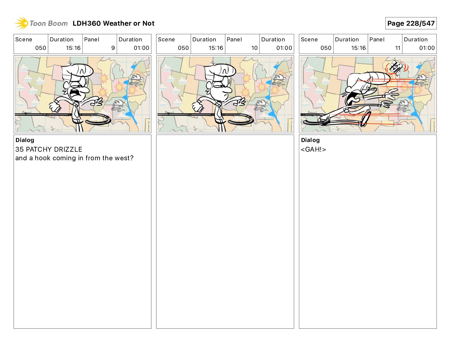 Dialog 35 PATCHY DRIZZLE and a hook coming in from the west? Scene 050 Duration 15 16 Panel 10 Duration 01 00 Scene 050 Duration 15 16 Panel 11 Duration 01 00 Dialog <GAH!> LDH360 Weather or Not Page 228/547