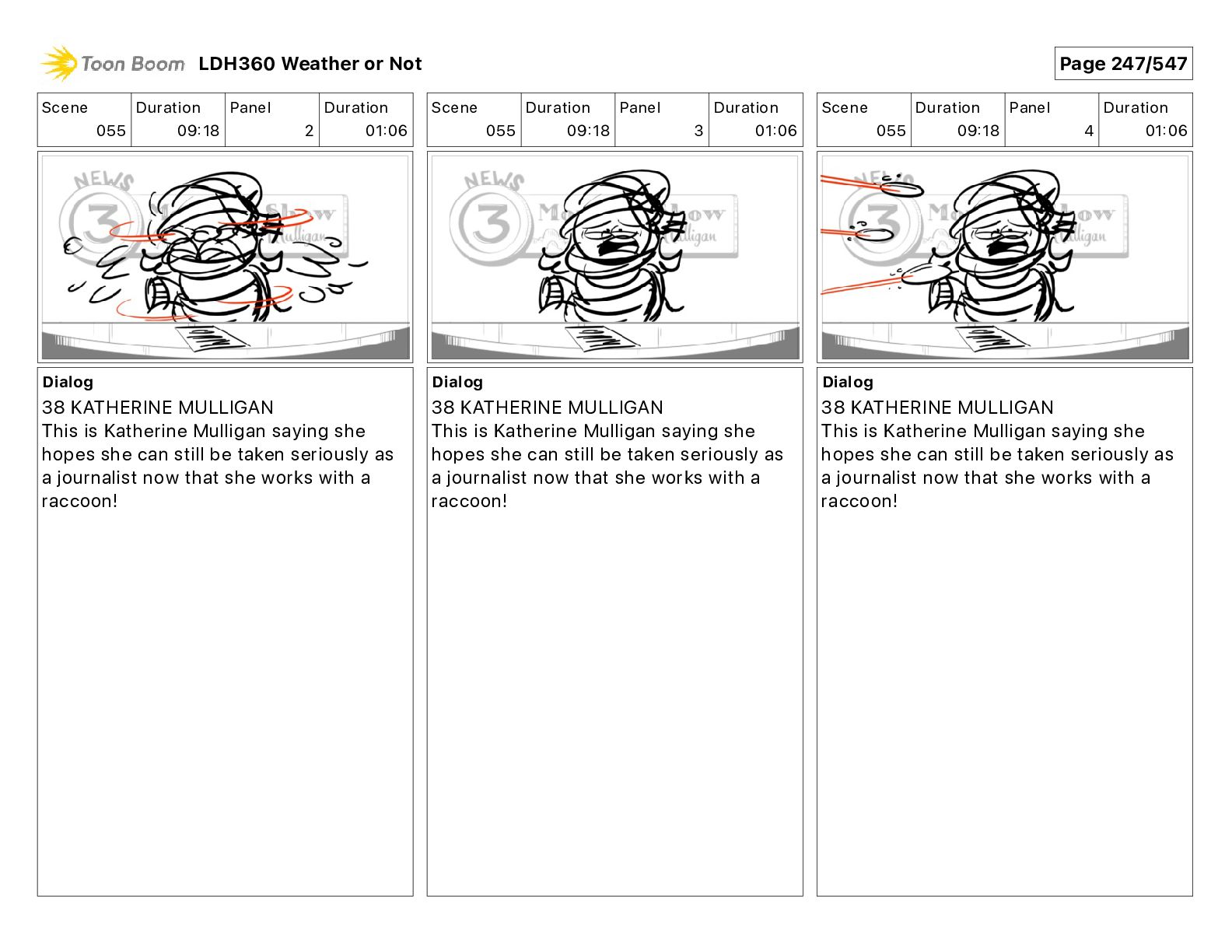 Dialog 38 KATHERINE MULLIGAN This is Katherine Mulligan saying she hopes she can still be taken seriously as a journalist now that she works with a raccoon! Scene 055 Duration 09 18 Panel 3 Duration 01 06 Dialog 38 KATHERINE MULLIGAN This is Katherine Mulligan saying she hopes she can still be taken seriously as a journalist now that she works with a raccoon! Scene 055 Duration 09 18 Panel 4 Duration 01 06 Dialog 38 KATHERINE MULLIGAN This is Katherine Mulligan saying she hopes she can still be taken seriously as a journalist now that she works with a raccoon! LDH360 Weather or Not Page 247/547