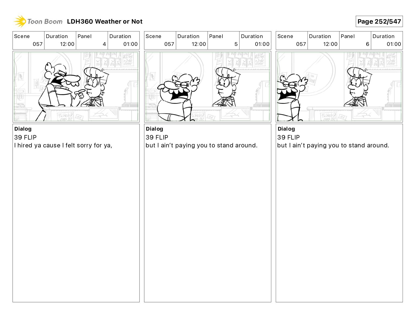 Dialog 39 FLIP I hired ya cause I felt sorry for ya, Scene 057 Duration 12 00 Panel 5 Duration 01 00 Dialog 39 FLIP but I ainʼt paying you to stand around. Scene 057 Duration 12 00 Panel 6 Duration 01 00 Dialog 39 FLIP but I ainʼt paying you to stand around. LDH360 Weather or Not Page 252/547