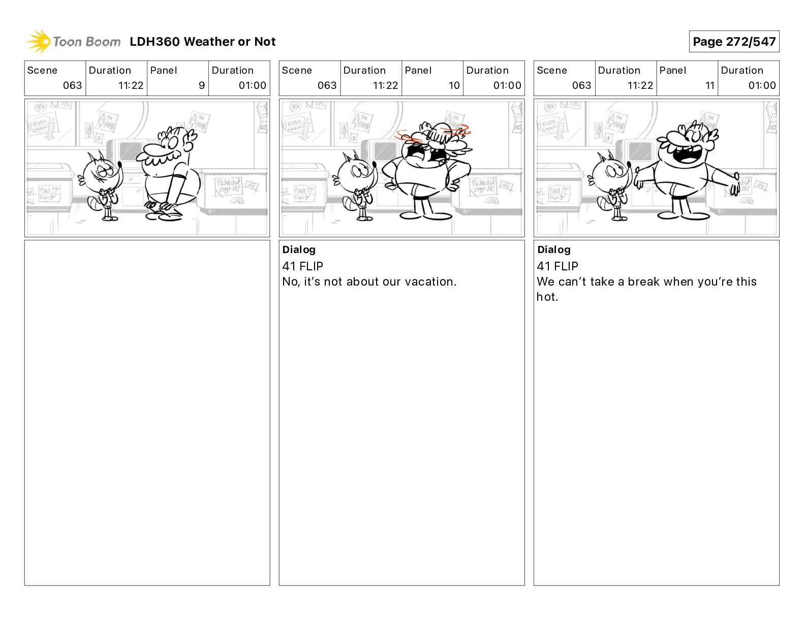 Scene 063 Duration 11 22 Panel 10 Duration 01 00 Dialog 41 FLIP No, itʼs not about our vacation. Scene 063 Duration 11 22 Panel 11 Duration 01 00 Dialog 41 FLIP We canʼt take a break when youʼre this hot. LDH360 Weather or Not Page 272/547