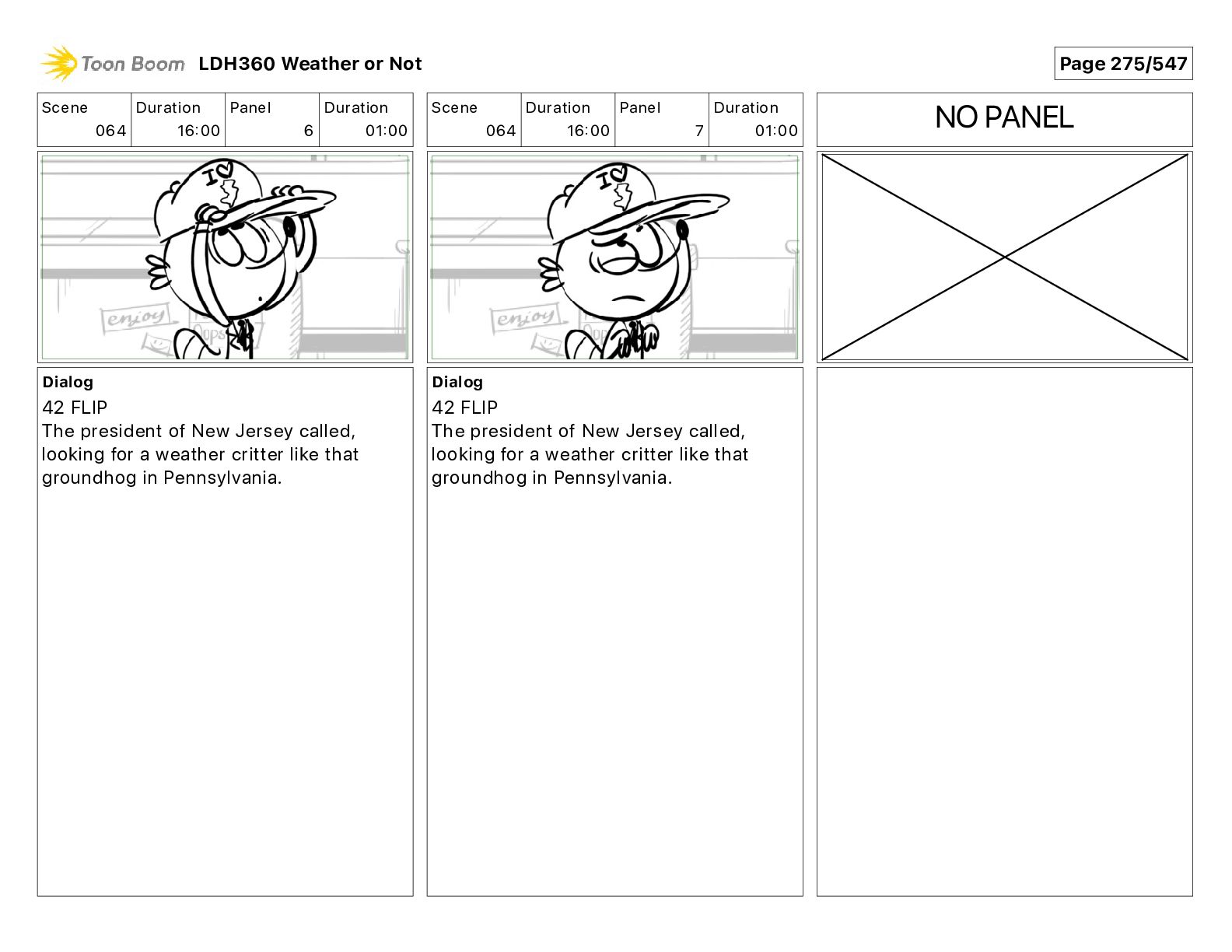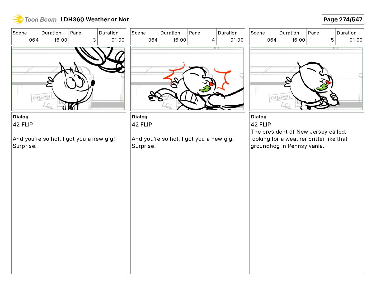 Dialog 42 FLIP And youʼre so hot, I got you a new gig! Surprise! Scene 064 Duration 16 00 Panel 4 Duration 01 00 Dialog 42 FLIP And youʼre so hot, I got you a new gig! Surprise! Scene 064 Duration 16 00 Panel 5 Duration 01 00 Dialog 42 FLIP The president of New Jersey called, looking for a weather critter like that groundhog in Pennsylvania. LDH360 Weather or Not Page 274/547