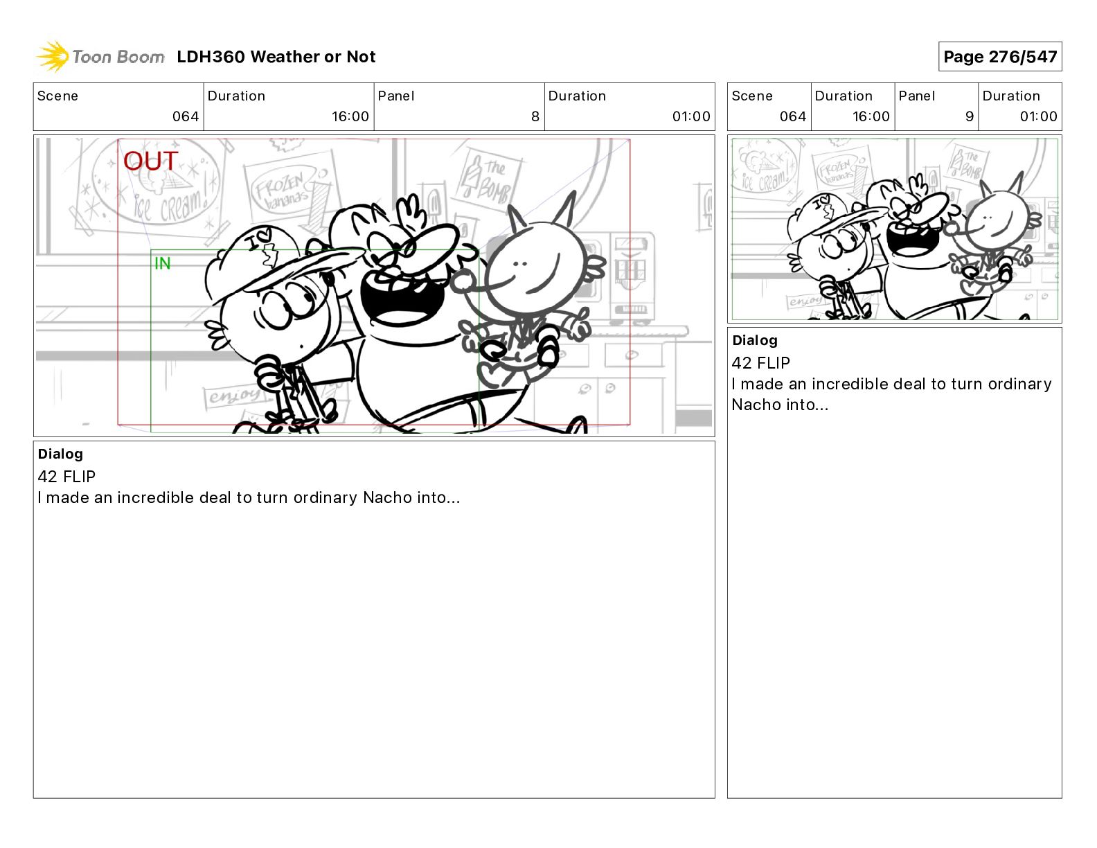 Dialog 42 FLIP I made an incredible deal to turn ordinary Nacho into... Scene 064 Duration 16 00 Panel 9 Duration 01 00 Dialog 42 FLIP I made an incredible deal to turn ordinary Nacho into... LDH360 Weather or Not Page 276/547