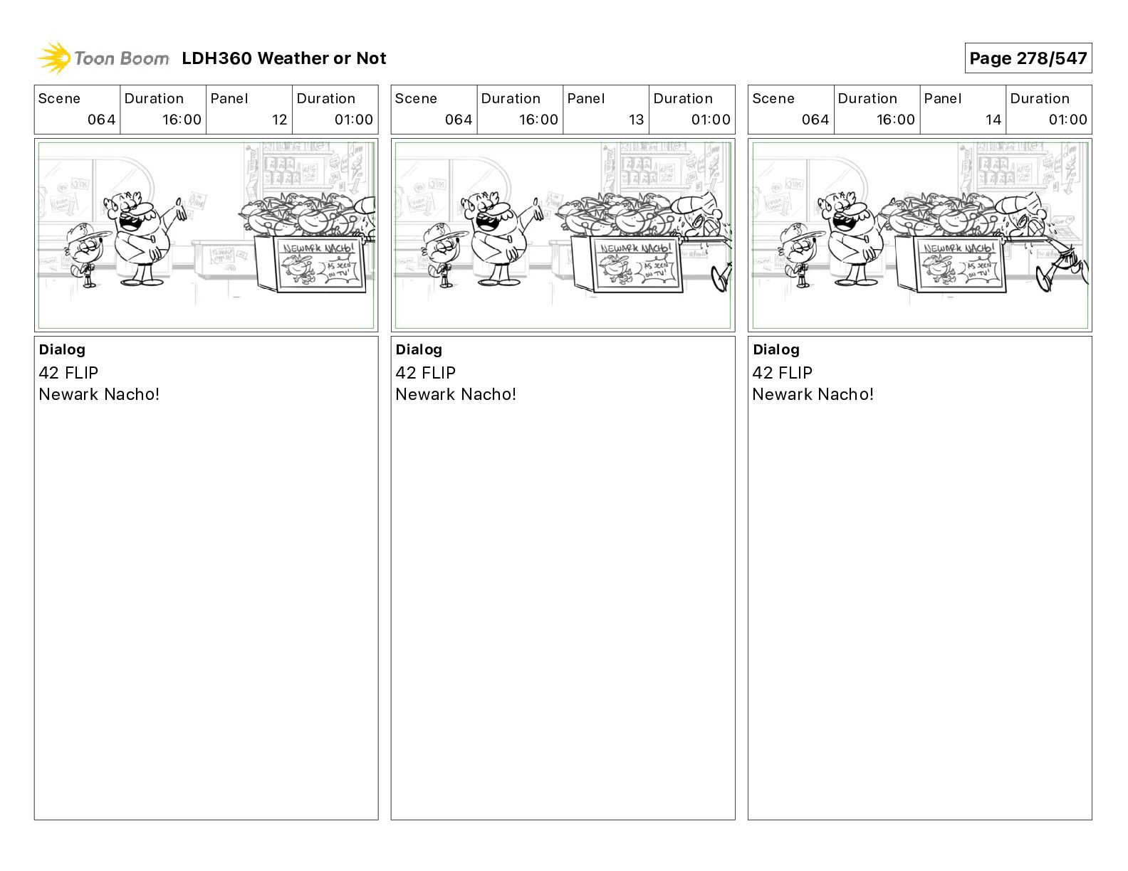 Dialog 42 FLIP I made an incredible deal to turn ordinary Nacho into... Scene 064 Duration 16 00 Panel 11 Duration 01 00 Dialog 42 FLIP Newark Nacho! LDH360 Weather or Not Page 277/547