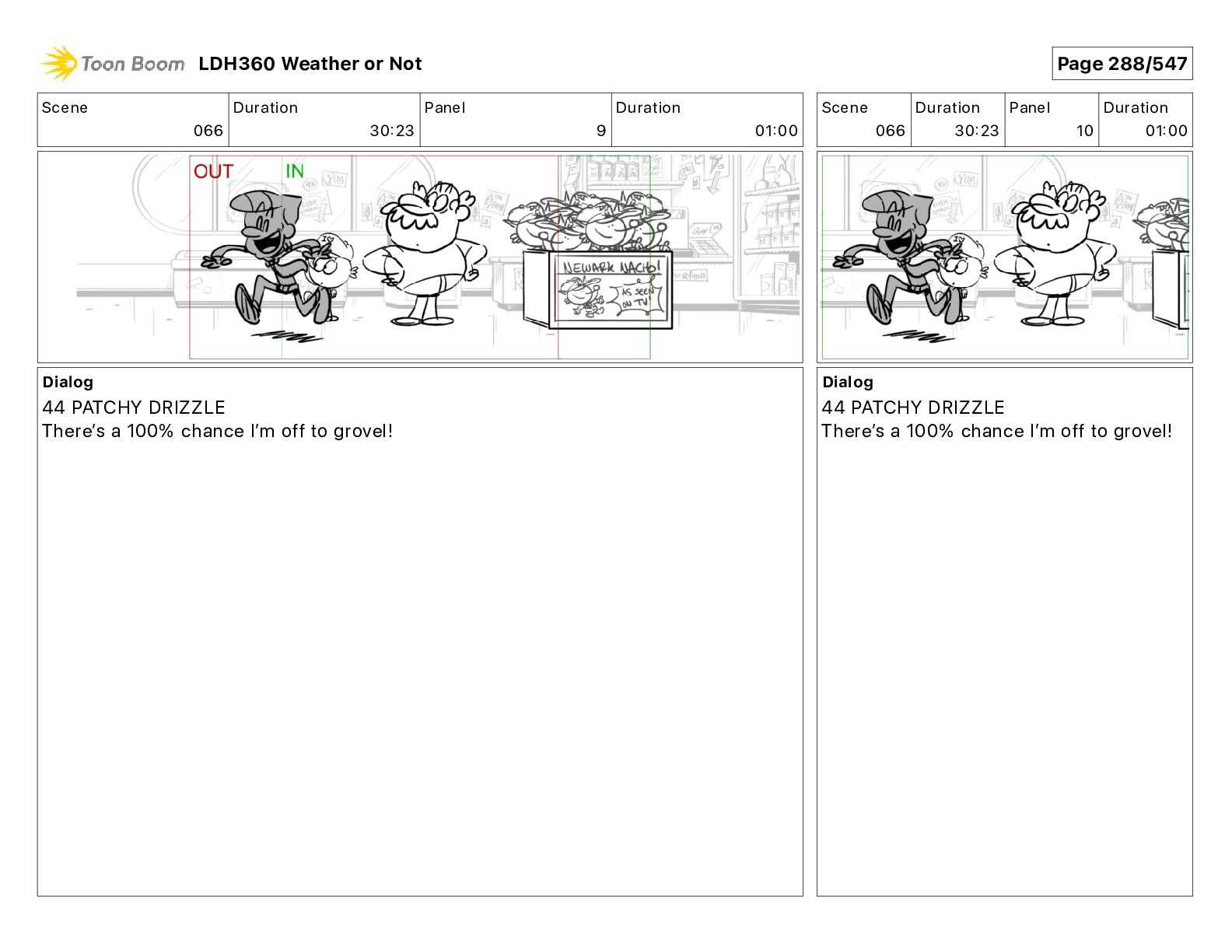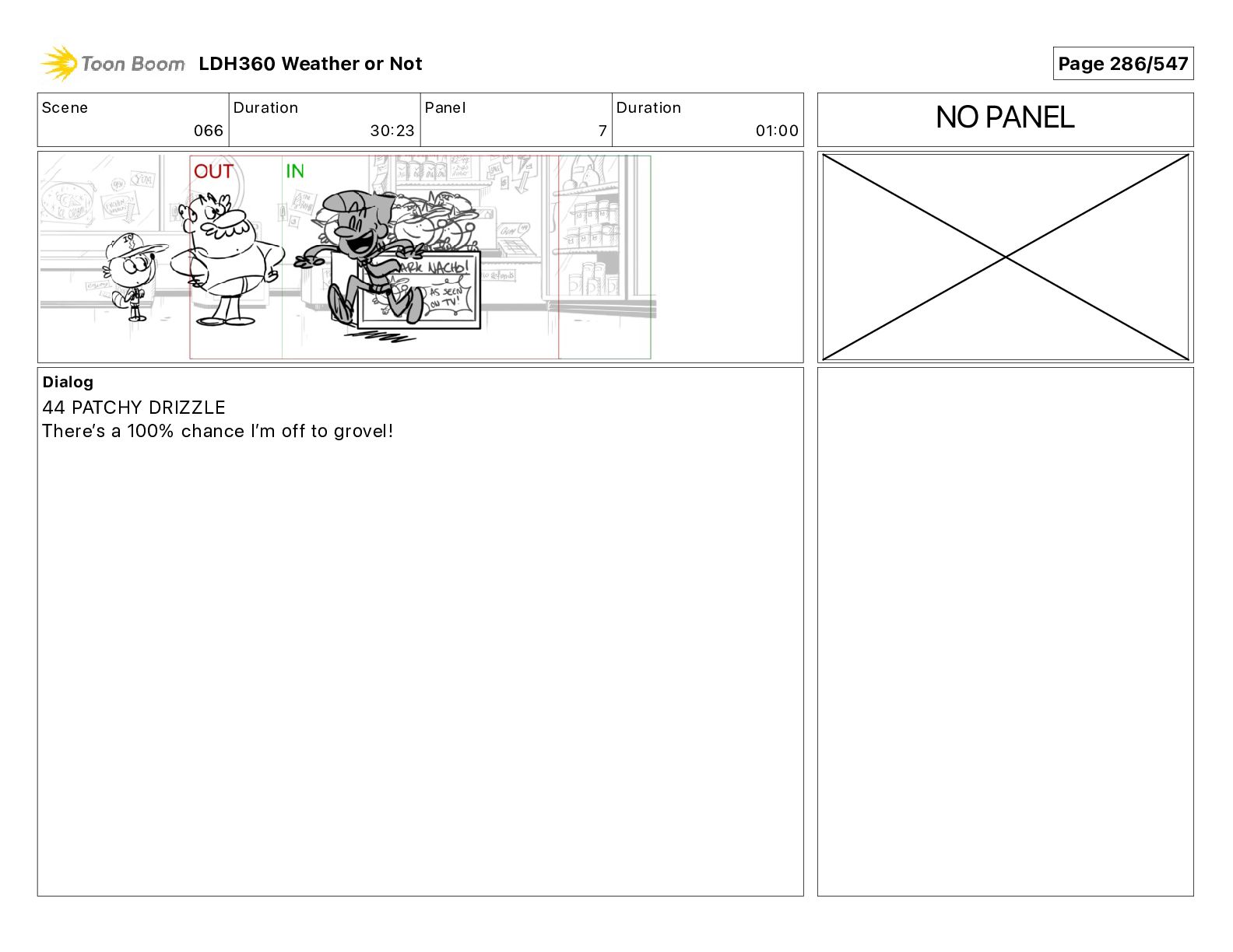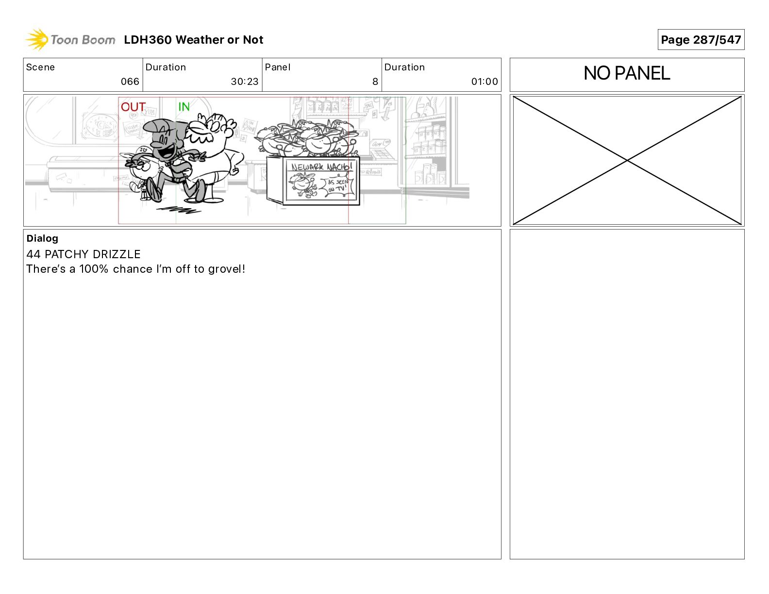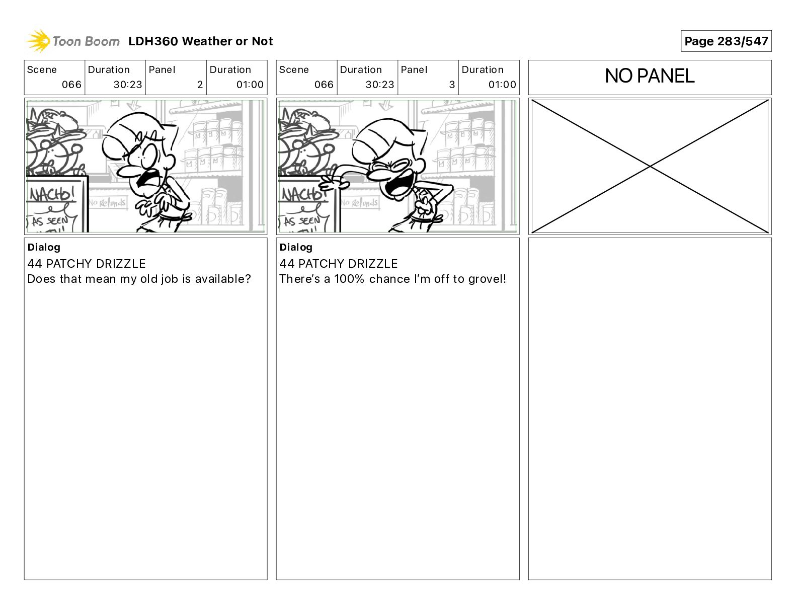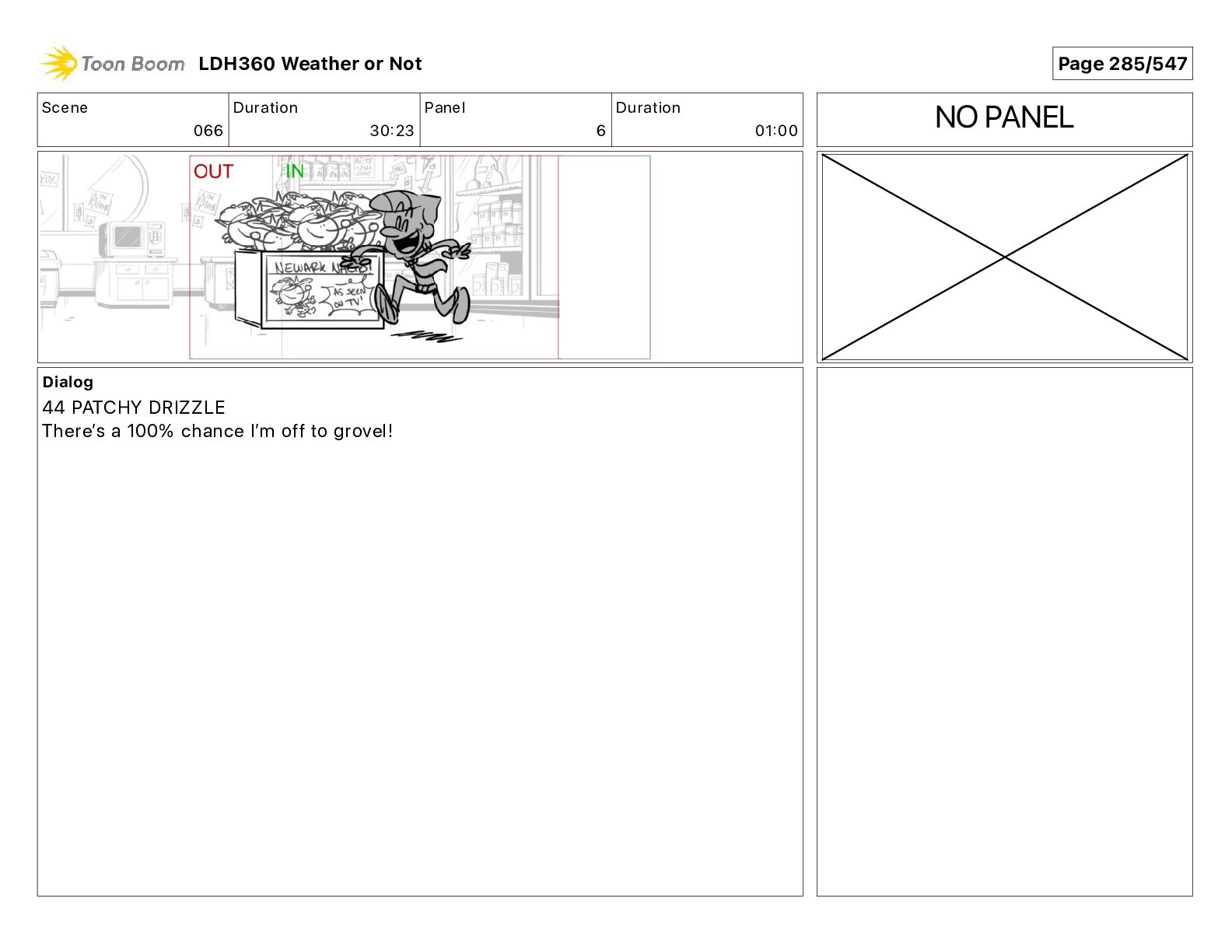 Dialog 44 PATCHY DRIZZLE Does that mean my old job is available? Scene 066 Duration 30 23 Panel 3 Duration 01 00 Dialog 44 PATCHY DRIZZLE Thereʼs a 100% chance Iʼm off to grovel! NO PANEL LDH360 Weather or Not Page 283/547