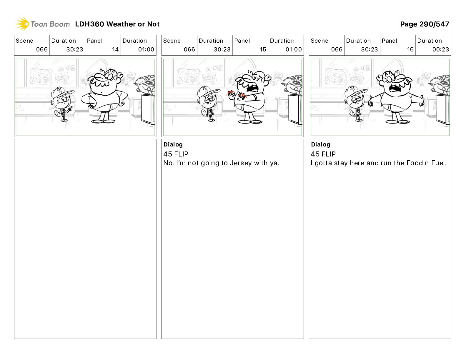 Scene 066 Duration 30 23 Panel 15 Duration 01 00 Dialog 45 FLIP No, Iʼm not going to Jersey with ya. Scene 066 Duration 30 23 Panel 16 Duration 00 23 Dialog 45 FLIP I gotta stay here and run the Food n Fuel. LDH360 Weather or Not Page 290/547
