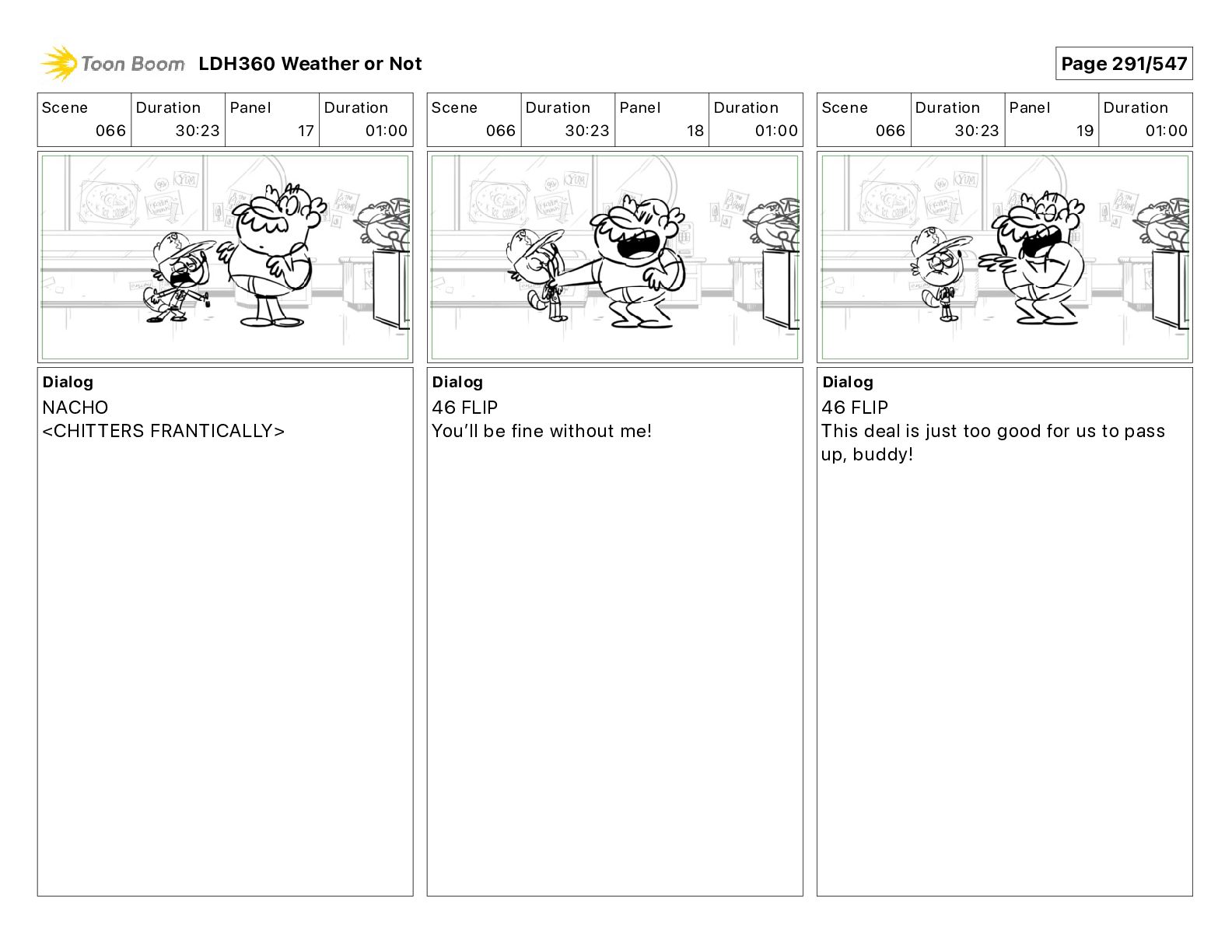 Dialog NACHO <CHITTERS FRANTICALLY> Scene 066 Duration 30 23 Panel 18 Duration 01 00 Dialog 46 FLIP Youʼll be fine without me! Scene 066 Duration 30 23 Panel 19 Duration 01 00 Dialog 46 FLIP This deal is just too good for us to pass up, buddy! LDH360 Weather or Not Page 291/547