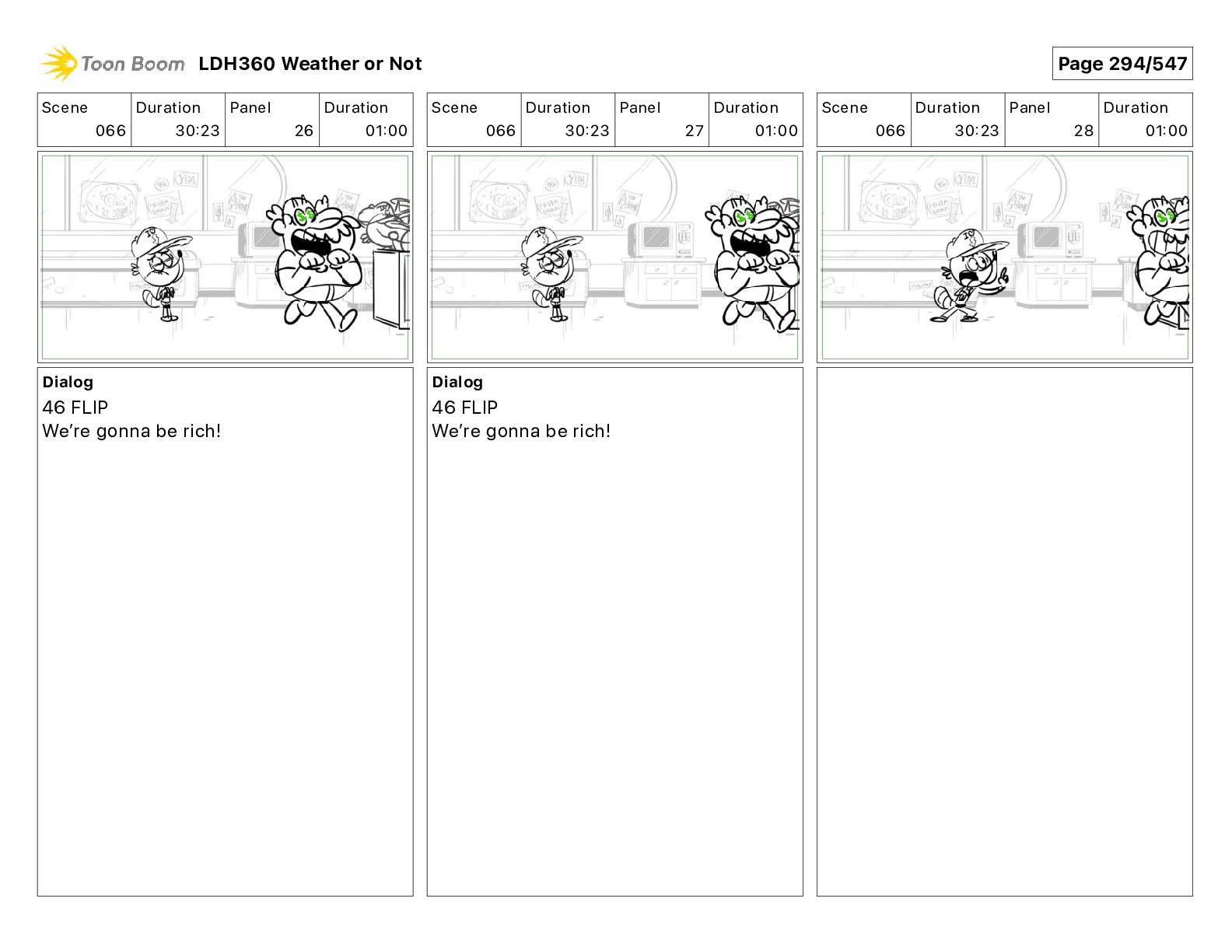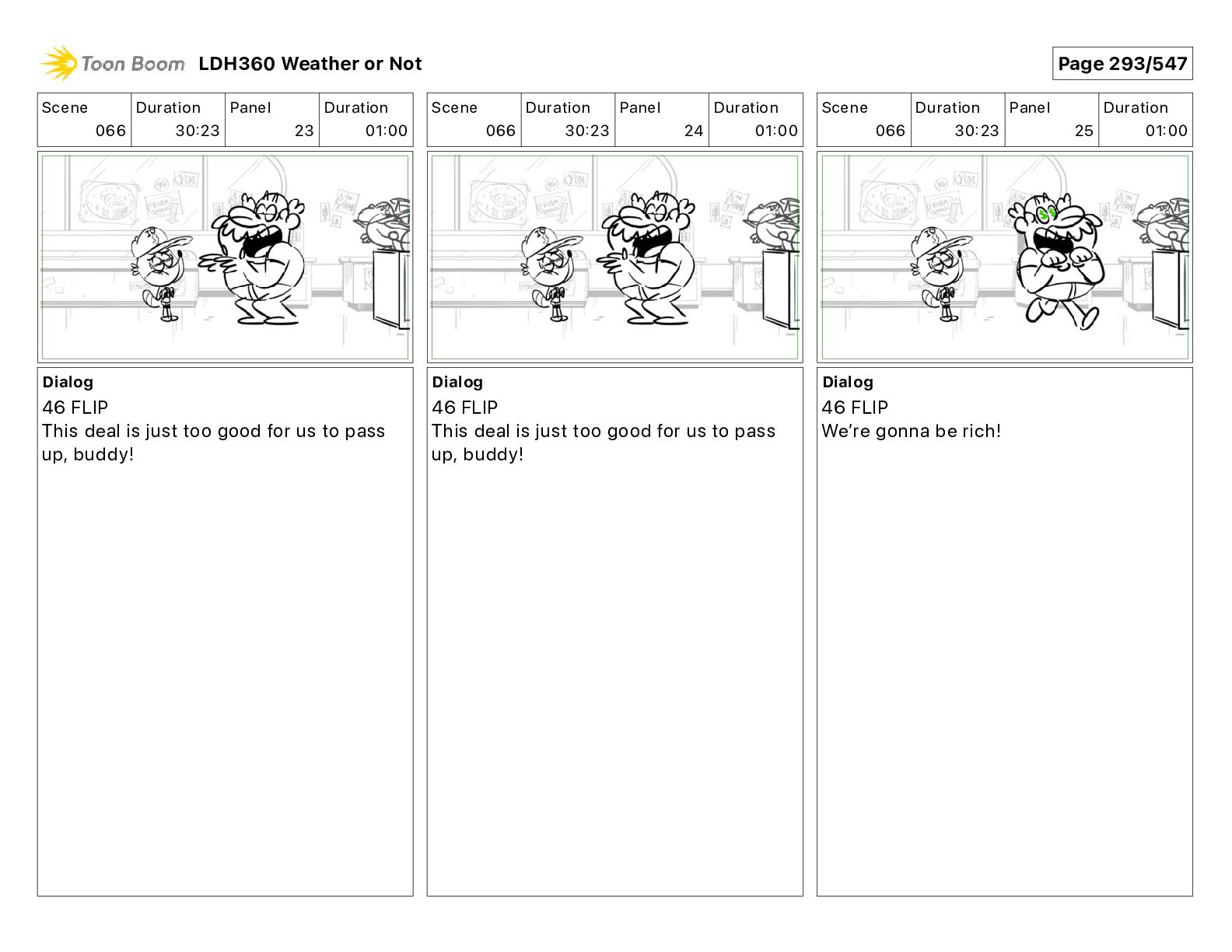 Dialog 46 FLIP This deal is just too good for us to pass up, buddy! Scene 066 Duration 30 23 Panel 24 Duration 01 00 Dialog 46 FLIP This deal is just too good for us to pass up, buddy! Scene 066 Duration 30 23 Panel 25 Duration 01 00 Dialog 46 FLIP Weʼre gonna be rich! LDH360 Weather or Not Page 293/547
