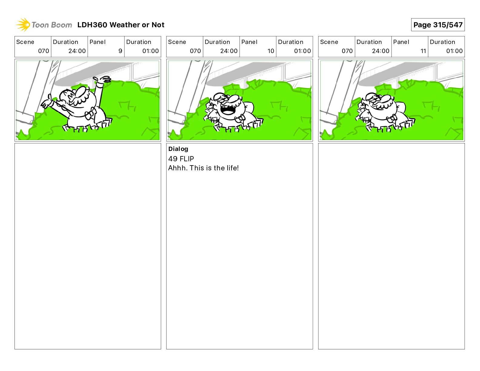 Scene 070 Duration 24 00 Panel 10 Duration 01 00 Dialog 49 FLIP Ahhh. This is the life! Scene 070 Duration 24 00 Panel 11 Duration 01 00 LDH360 Weather or Not Page 315/547