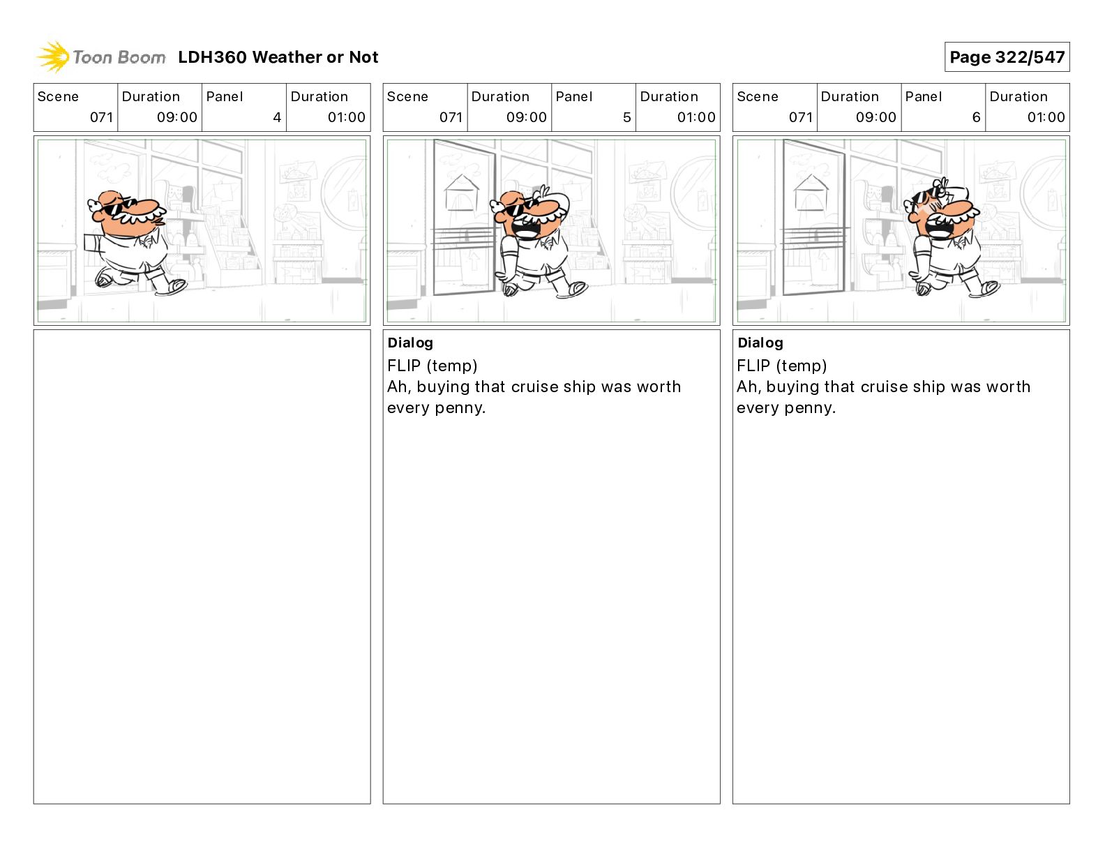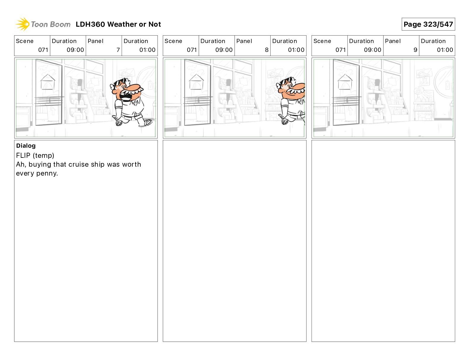 Scene 071 Duration 09 00 Panel 5 Duration 01 00 Dialog FLIP (temp) Ah, buying that cruise ship was worth every penny. Scene 071 Duration 09 00 Panel 6 Duration 01 00 Dialog FLIP (temp) Ah, buying that cruise ship was worth every penny. LDH360 Weather or Not Page 322/547