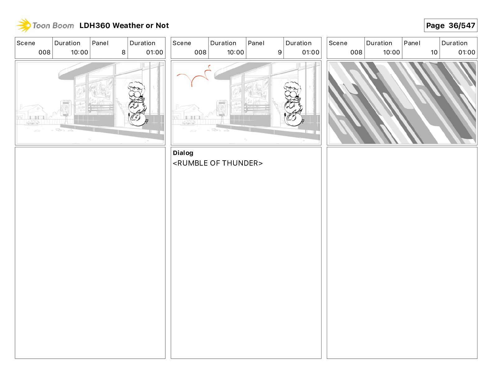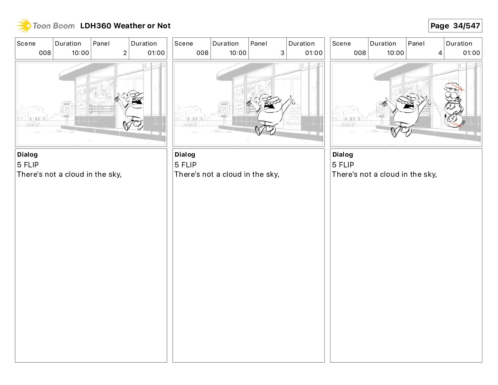 Dialog 5 FLIP Thereʼs not a cloud in the sky, Scene 008 Duration 10 00 Panel 3 Duration 01 00 Dialog 5 FLIP Thereʼs not a cloud in the sky, Scene 008 Duration 10 00 Panel 4 Duration 01 00 Dialog 5 FLIP Thereʼs not a cloud in the sky, LDH360 Weather or Not Page 34/547