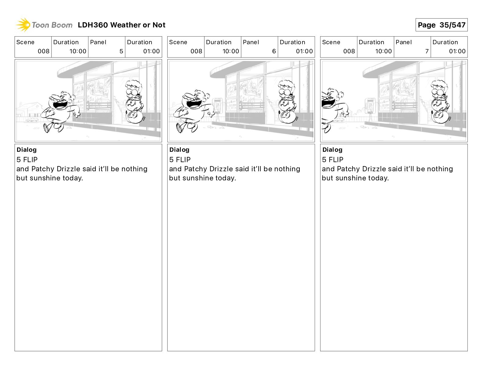 Dialog 5 FLIP and Patchy Drizzle said itʼll be nothing but sunshine today. Scene 008 Duration 10 00 Panel 6 Duration 01 00 Dialog 5 FLIP and Patchy Drizzle said itʼll be nothing but sunshine today. Scene 008 Duration 10 00 Panel 7 Duration 01 00 Dialog 5 FLIP and Patchy Drizzle said itʼll be nothing but sunshine today. LDH360 Weather or Not Page 35/547