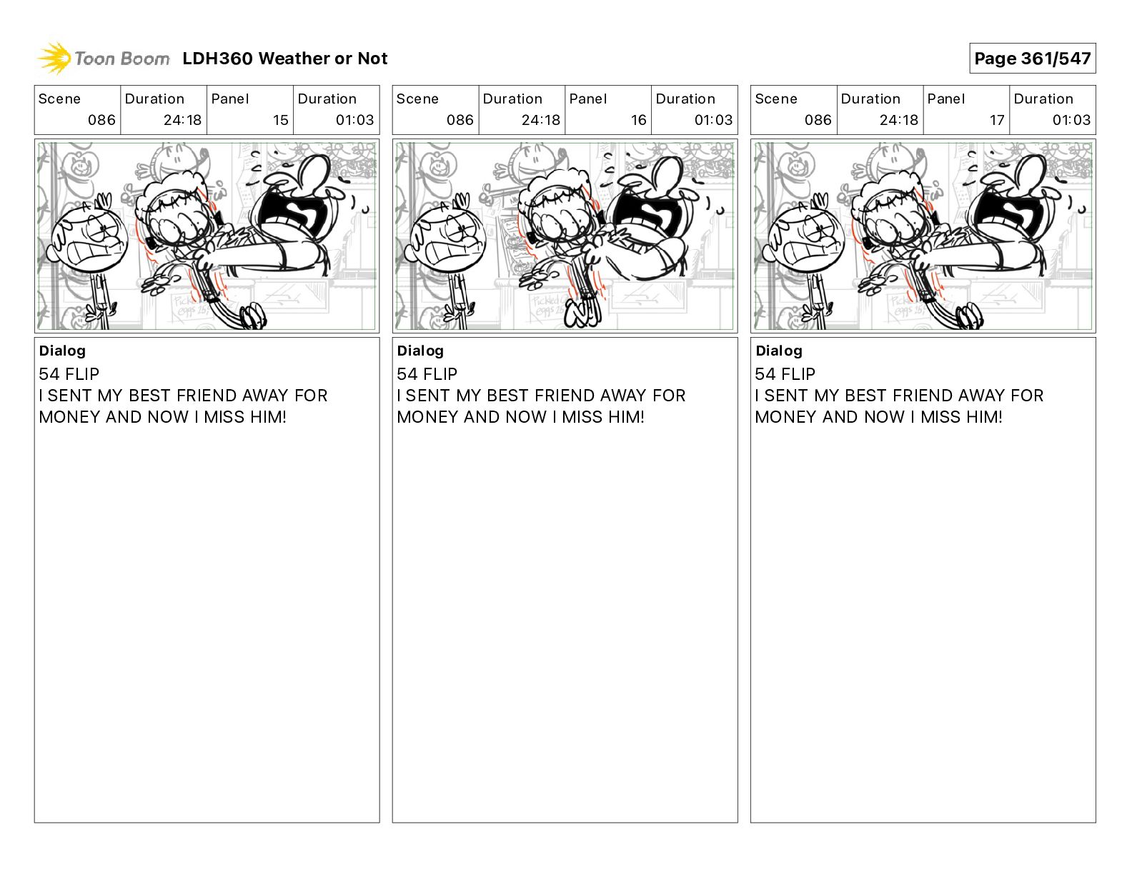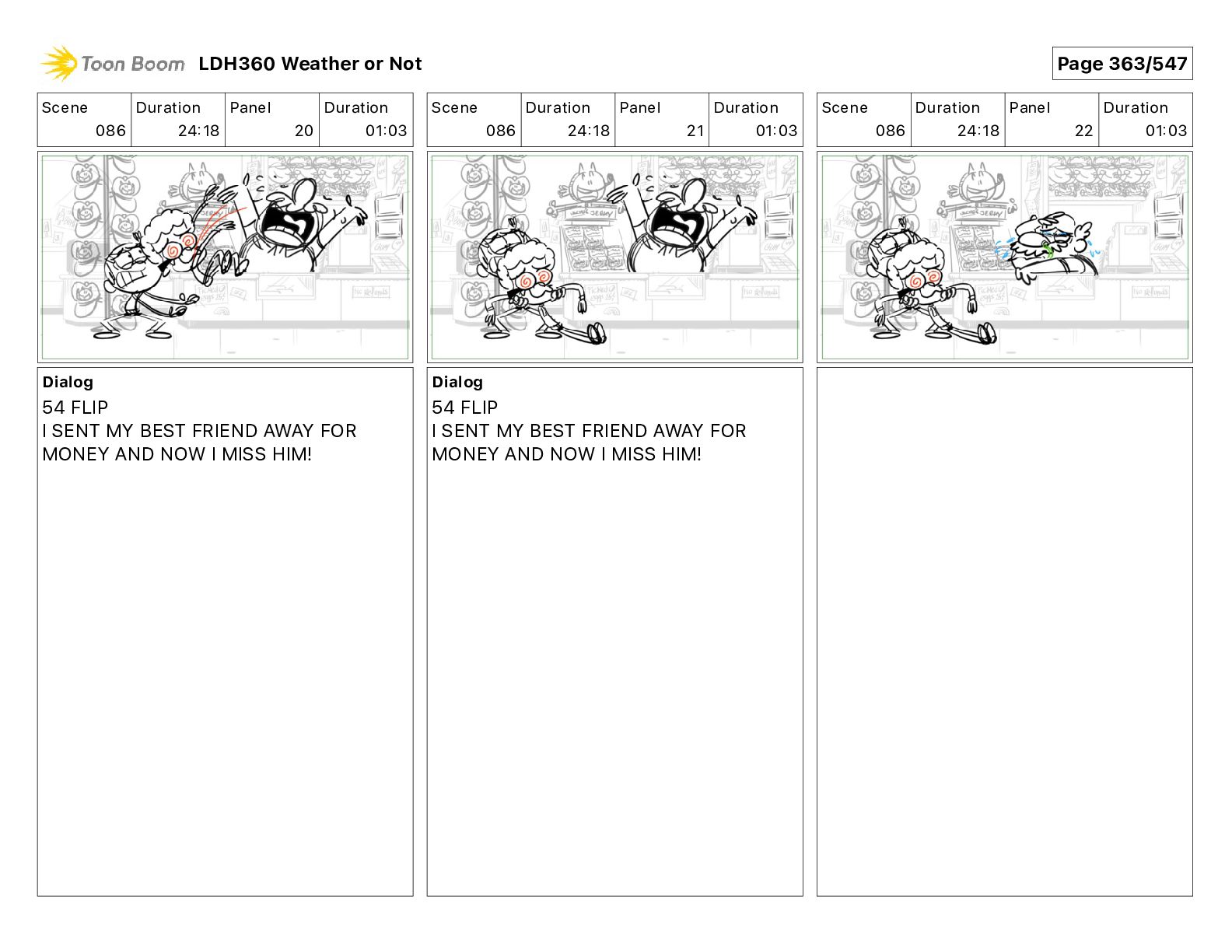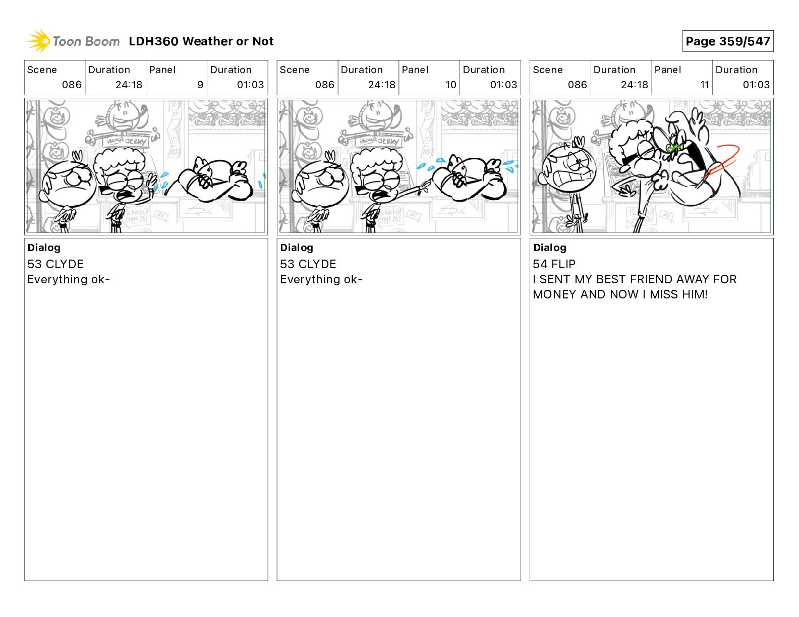Dialog 53 CLYDE Everything ok- Scene 086 Duration 24 18 Panel 10 Duration 01 03 Dialog 53 CLYDE Everything ok- Scene 086 Duration 24 18 Panel 11 Duration 01 03 Dialog 54 FLIP I SENT MY BEST FRIEND AWAY FOR MONEY AND NOW I MISS HIM! LDH360 Weather or Not Page 359/547