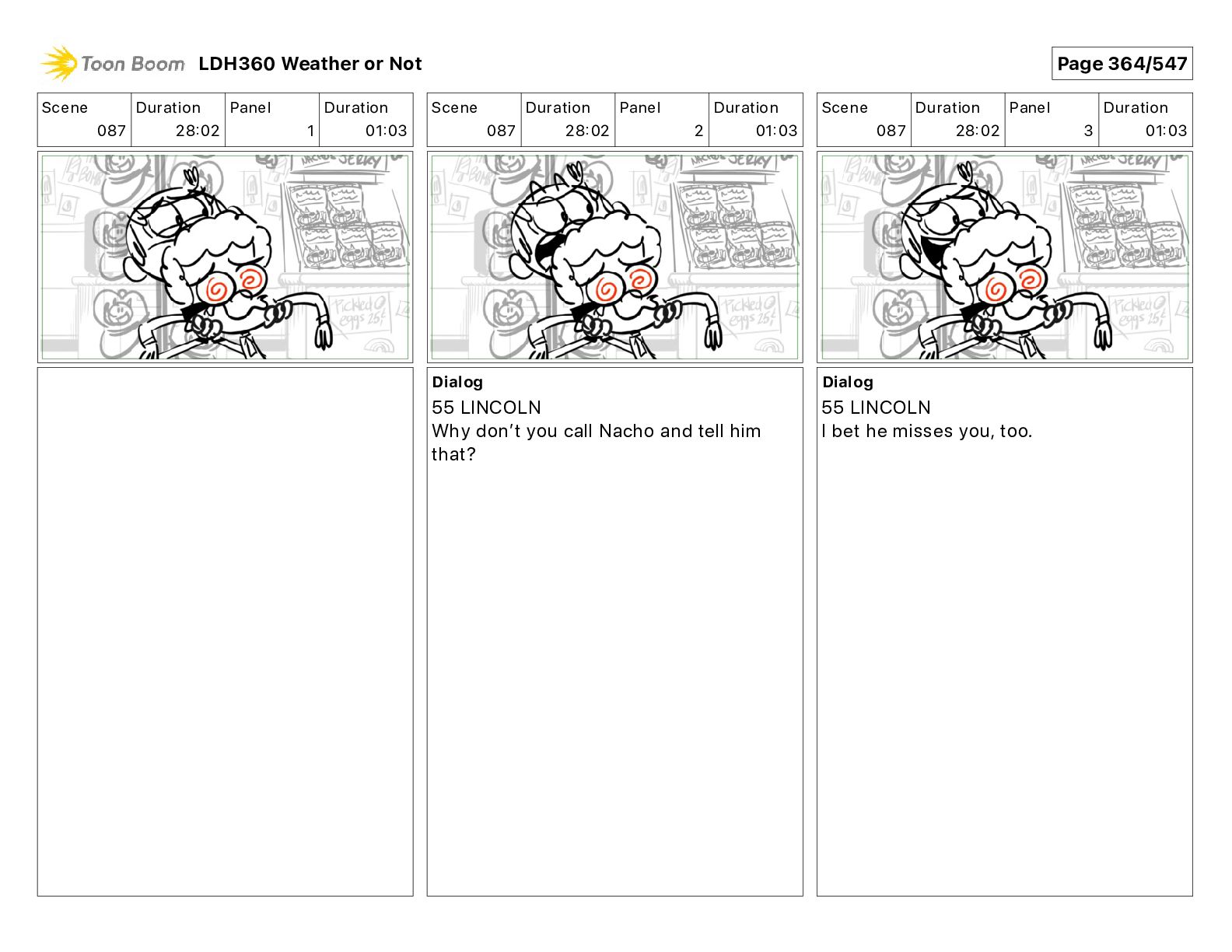 Scene 087 Duration 28 02 Panel 2 Duration 01 03 Dialog 55 LINCOLN Why donʼt you call Nacho and tell him that? Scene 087 Duration 28 02 Panel 3 Duration 01 03 Dialog 55 LINCOLN I bet he misses you, too. LDH360 Weather or Not Page 364/547
