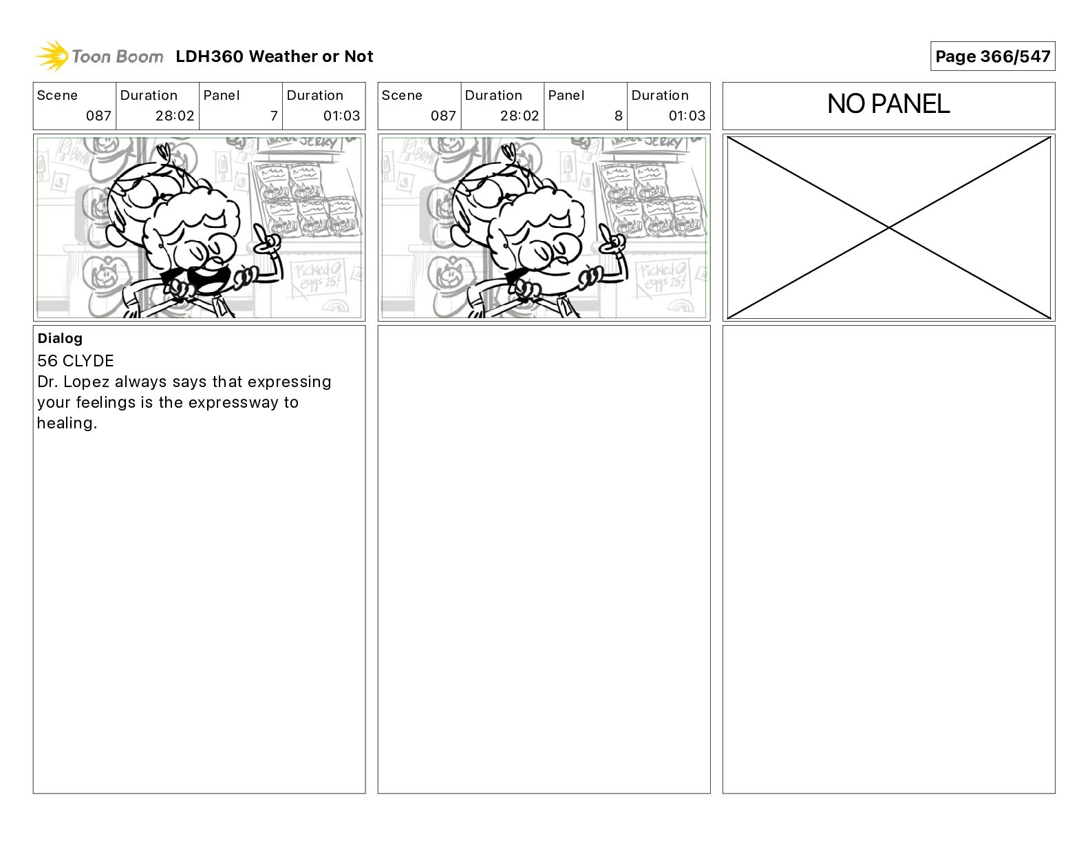 Dialog 56 CLYDE Dr. Lopez always says that expressing your feelings is the expressway to healing. Scene 087 Duration 28 02 Panel 8 Duration 01 03 NO PANEL LDH360 Weather or Not Page 366/547