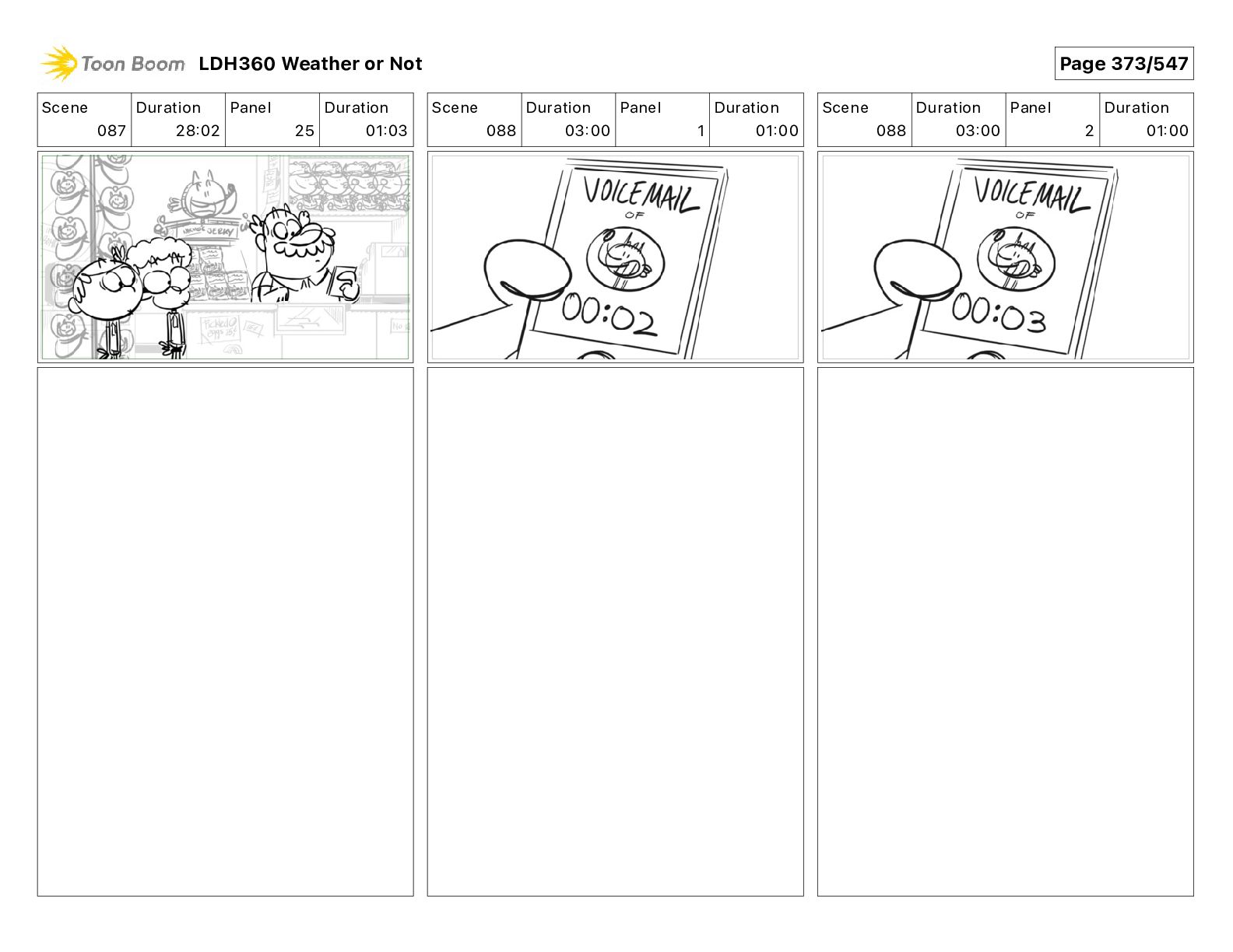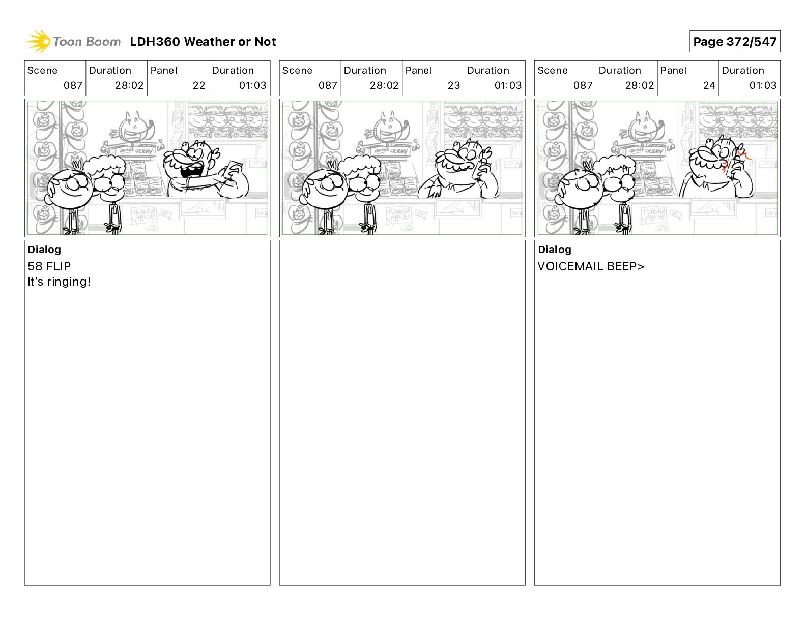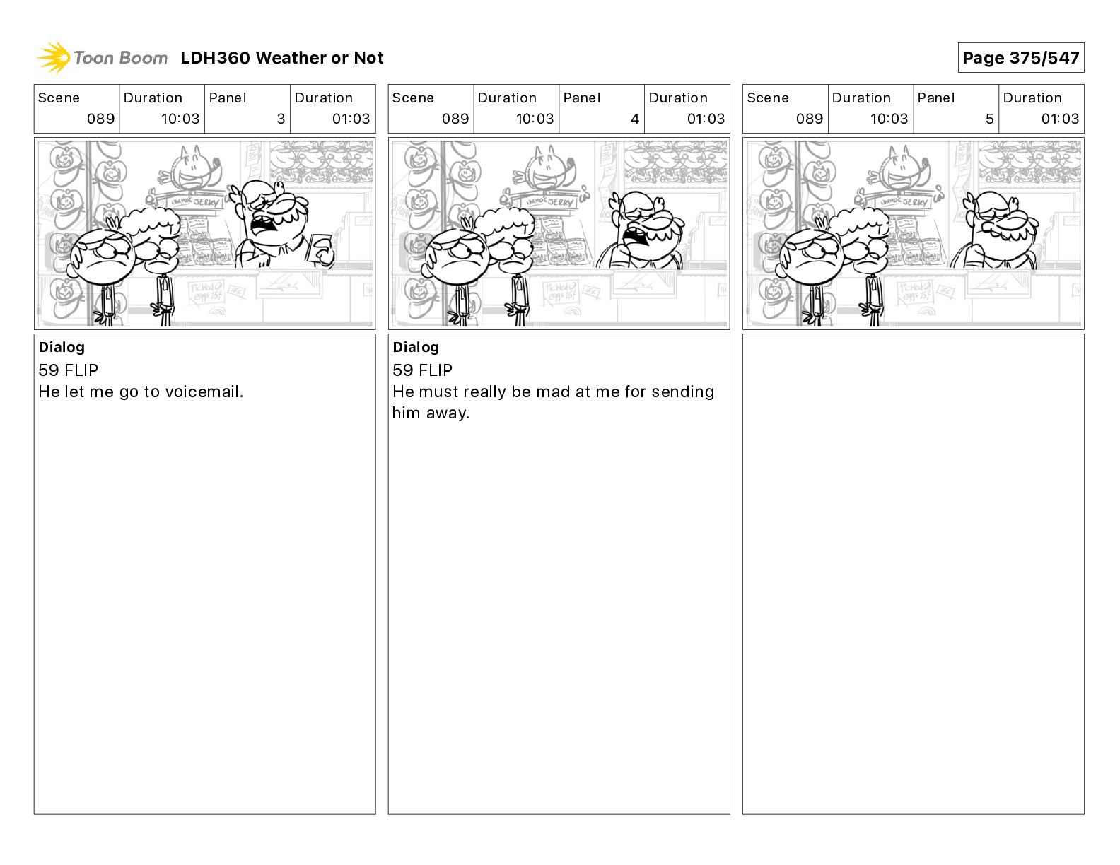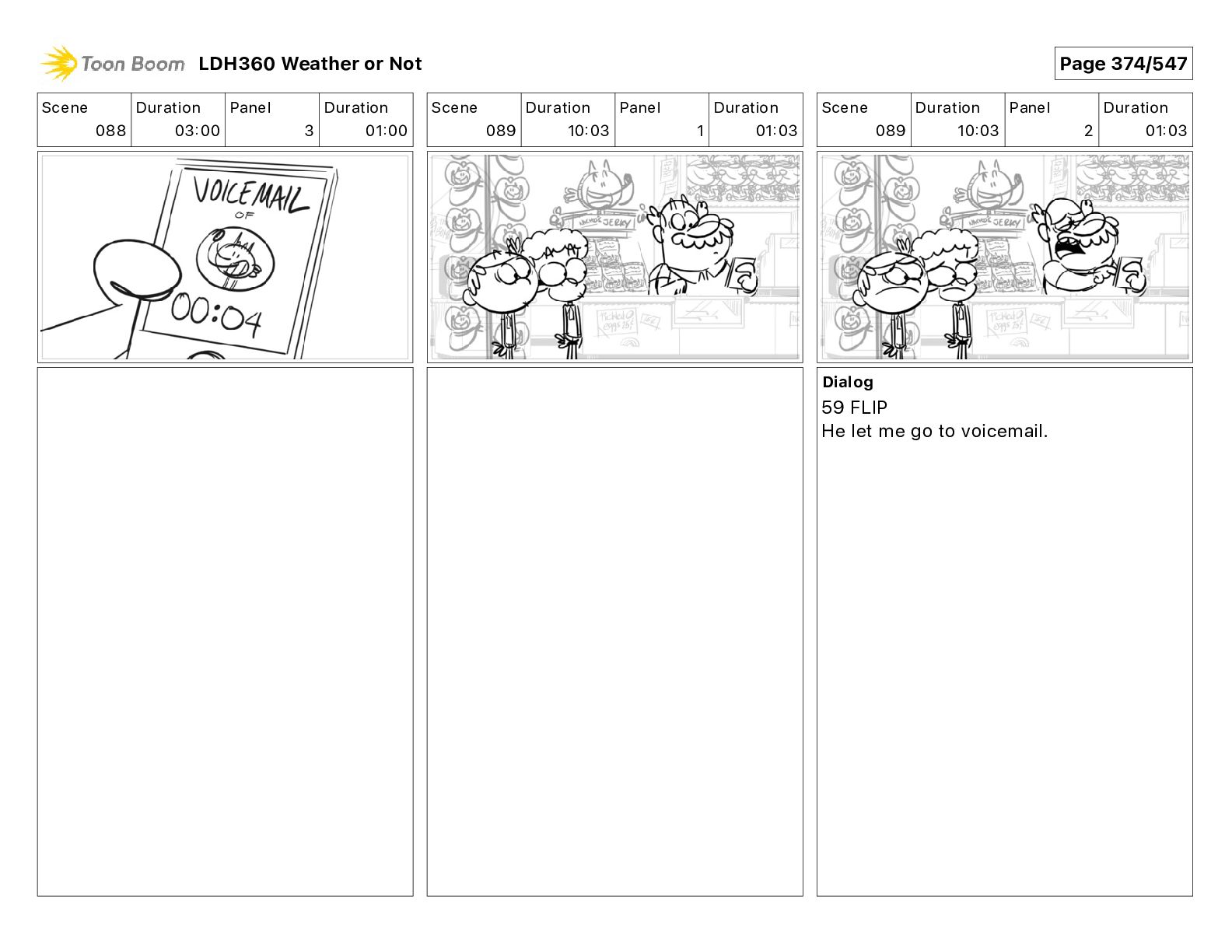 Scene 089 Duration 10 03 Panel 1 Duration 01 03 Scene 089 Duration 10 03 Panel 2 Duration 01 03 Dialog 59 FLIP He let me go to voicemail. LDH360 Weather or Not Page 374/547