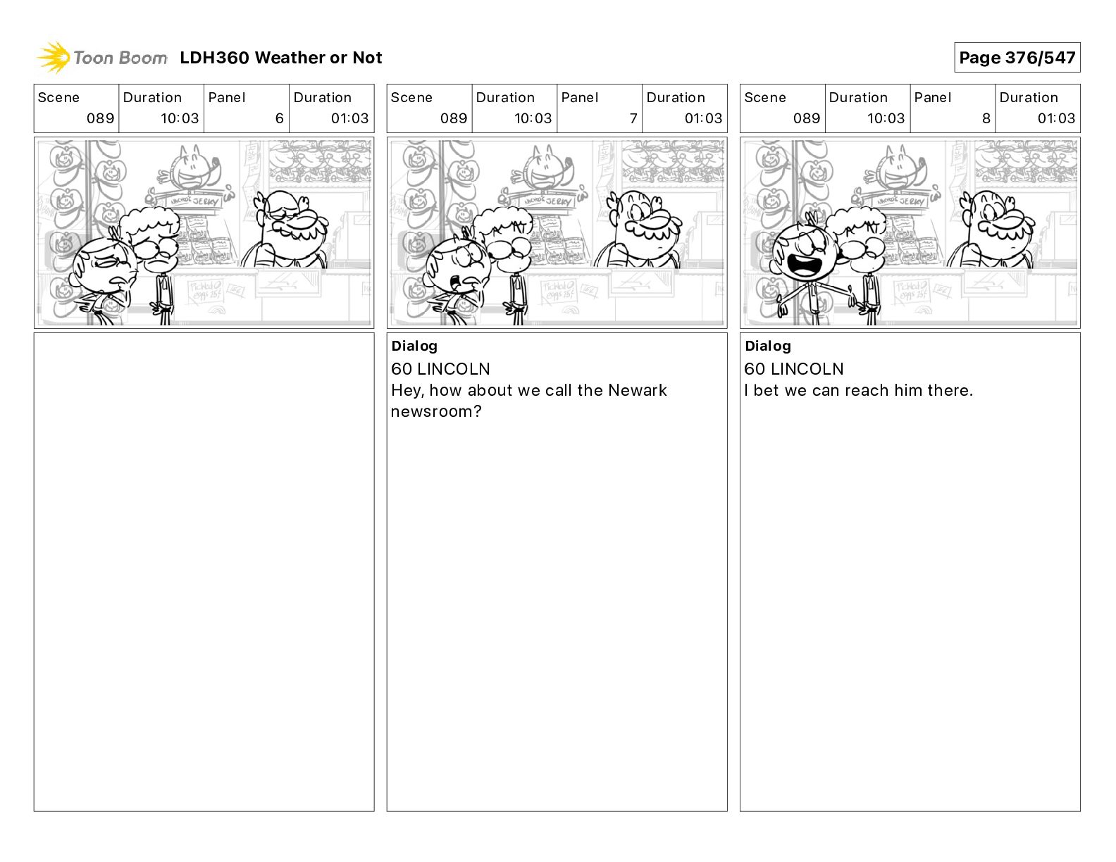 Scene 089 Duration 10 03 Panel 7 Duration 01 03 Dialog 60 LINCOLN Hey, how about we call the Newark newsroom? Scene 089 Duration 10 03 Panel 8 Duration 01 03 Dialog 60 LINCOLN I bet we can reach him there. LDH360 Weather or Not Page 376/547