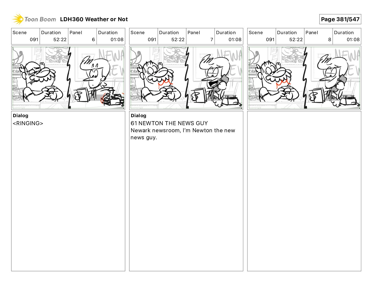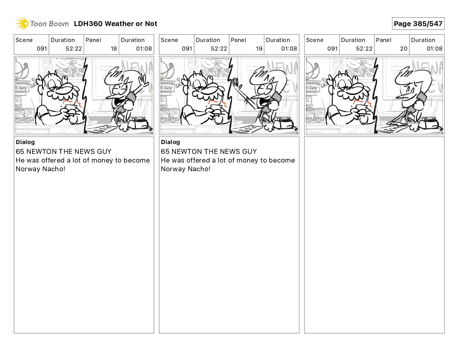 Dialog 65 NEWTON THE NEWS GUY He was offered a lot of money to become Norway Nacho! Scene 091 Duration 52 22 Panel 19 Duration 01 08 Dialog 65 NEWTON THE NEWS GUY He was offered a lot of money to become Norway Nacho! Scene 091 Duration 52 22 Panel 20 Duration 01 08 LDH360 Weather or Not Page 385/547