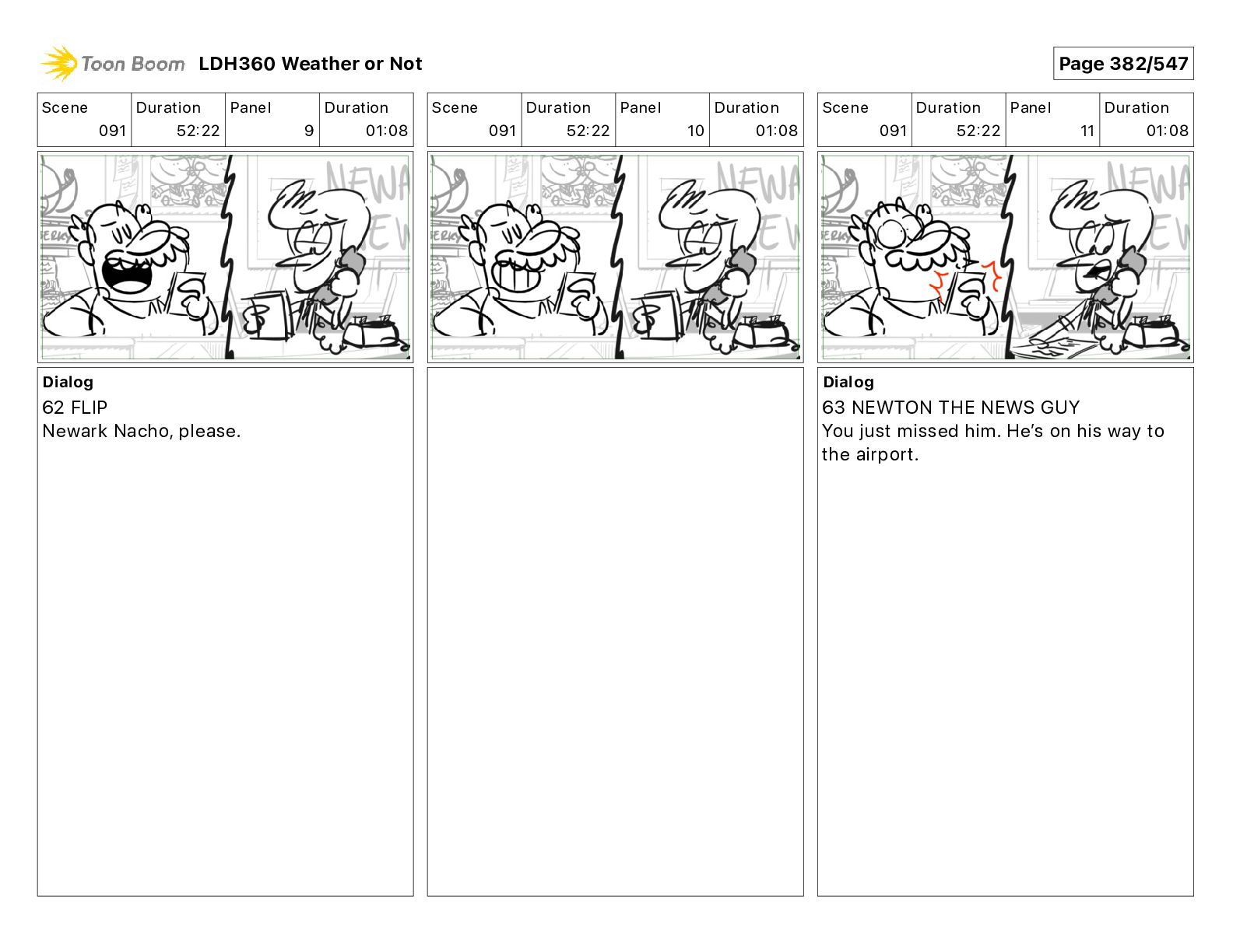 Dialog 62 FLIP Newark Nacho, please. Scene 091 Duration 52 22 Panel 10 Duration 01 08 Scene 091 Duration 52 22 Panel 11 Duration 01 08 Dialog 63 NEWTON THE NEWS GUY You just missed him. Heʼs on his way to the airport. LDH360 Weather or Not Page 382/547
