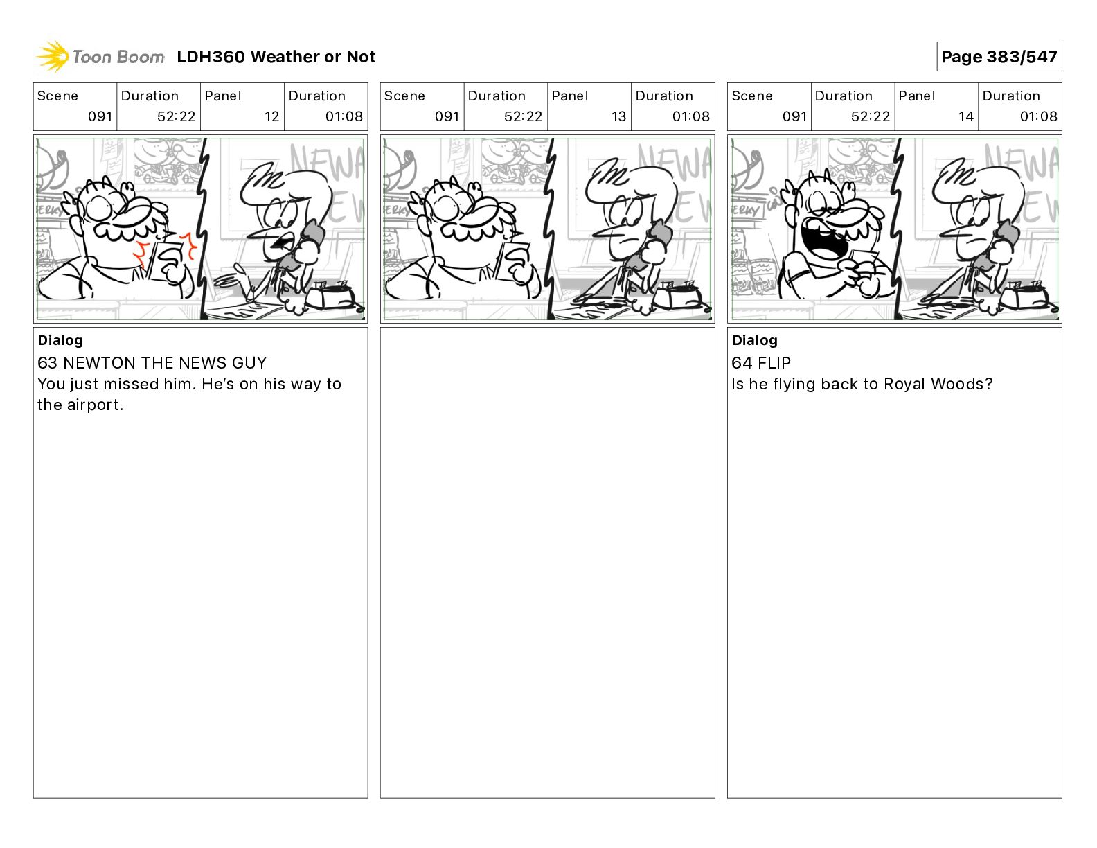 Dialog 63 NEWTON THE NEWS GUY You just missed him. Heʼs on his way to the airport. Scene 091 Duration 52 22 Panel 13 Duration 01 08 Scene 091 Duration 52 22 Panel 14 Duration 01 08 Dialog 64 FLIP Is he flying back to Royal Woods? LDH360 Weather or Not Page 383/547