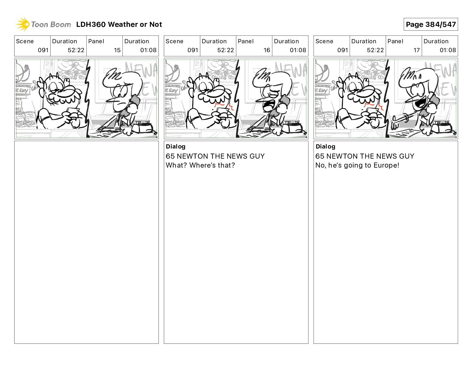 Scene 091 Duration 52 22 Panel 16 Duration 01 08 Dialog 65 NEWTON THE NEWS GUY What? Whereʼs that? Scene 091 Duration 52 22 Panel 17 Duration 01 08 Dialog 65 NEWTON THE NEWS GUY No, heʼs going to Europe! LDH360 Weather or Not Page 384/547