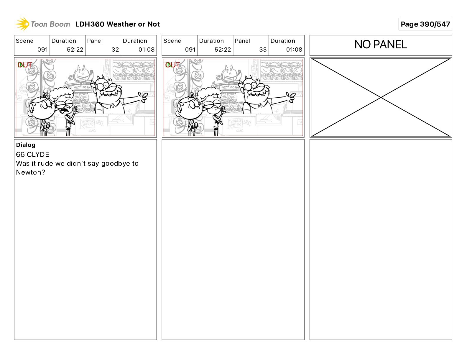 Dialog 66 CLYDE Was it rude we didnʼt say goodbye to Newton? Scene 091 Duration 52 22 Panel 33 Duration 01 08 NO PANEL LDH360 Weather or Not Page 390/547