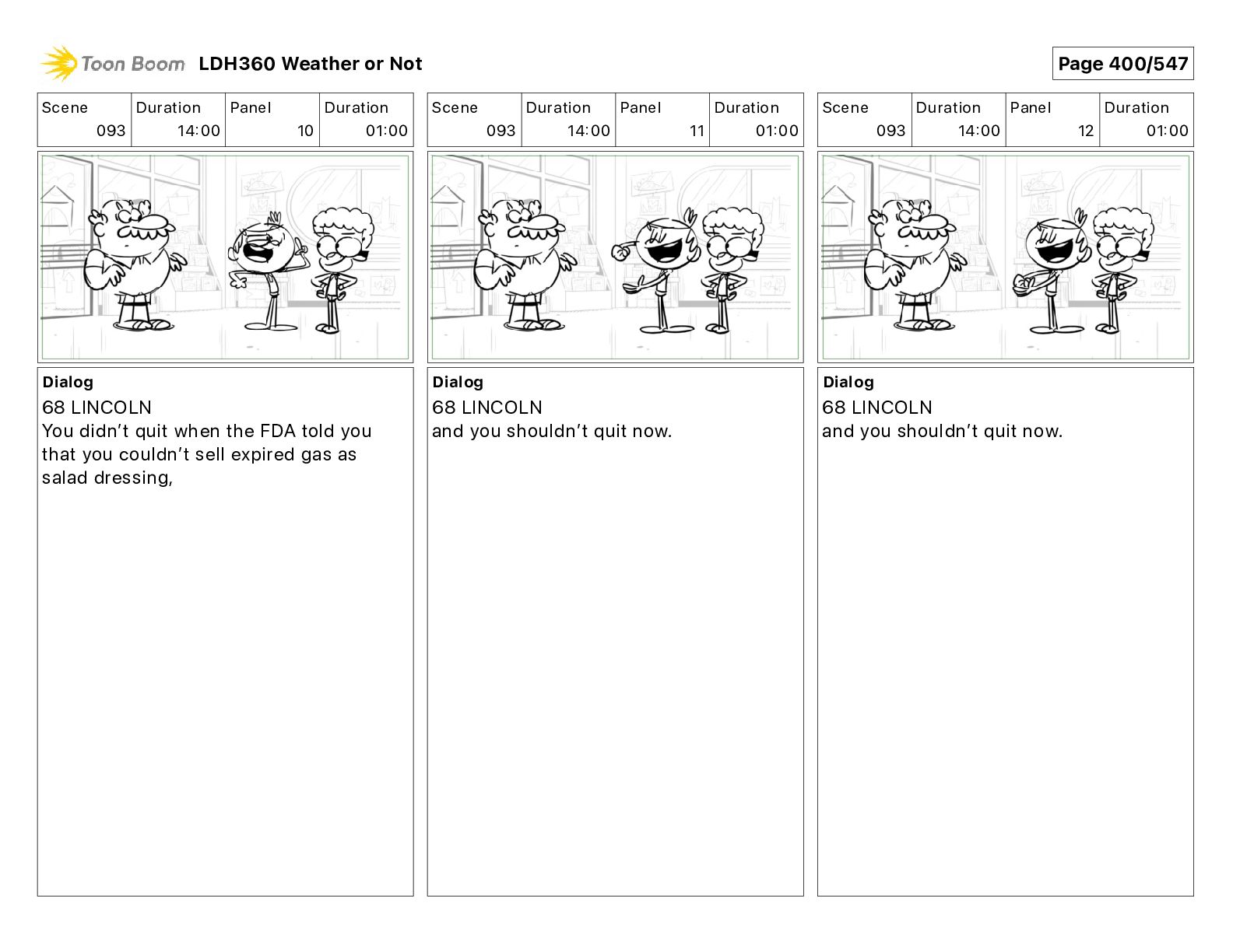 Dialog 68 LINCOLN You didnʼt quit when the FDA told you that you couldnʼt sell expired gas as salad dressing, Scene 093 Duration 14 00 Panel 11 Duration 01 00 Dialog 68 LINCOLN and you shouldnʼt quit now. Scene 093 Duration 14 00 Panel 12 Duration 01 00 Dialog 68 LINCOLN and you shouldnʼt quit now. LDH360 Weather or Not Page 400/547