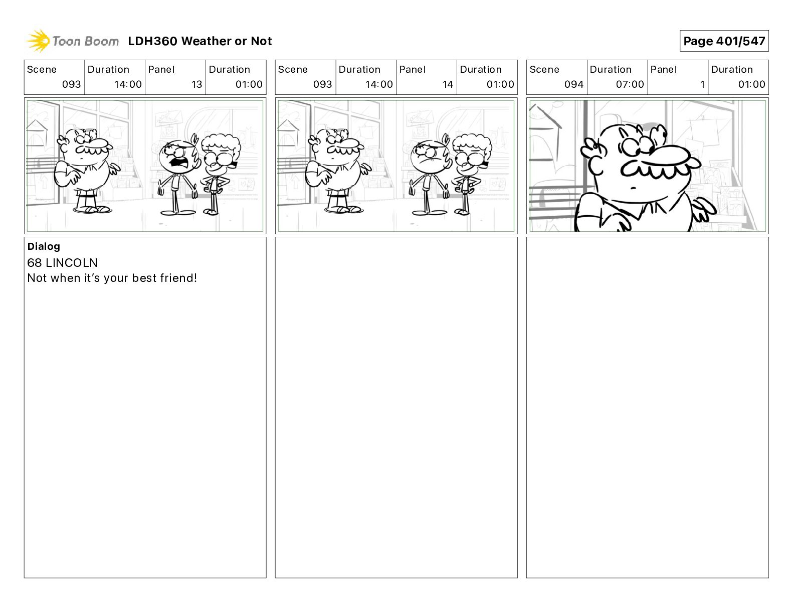 Dialog 68 LINCOLN Not when itʼs your best friend! Scene 093 Duration 14 00 Panel 14 Duration 01 00 Scene 094 Duration 07 00 Panel 1 Duration 01 00 LDH360 Weather or Not Page 401/547