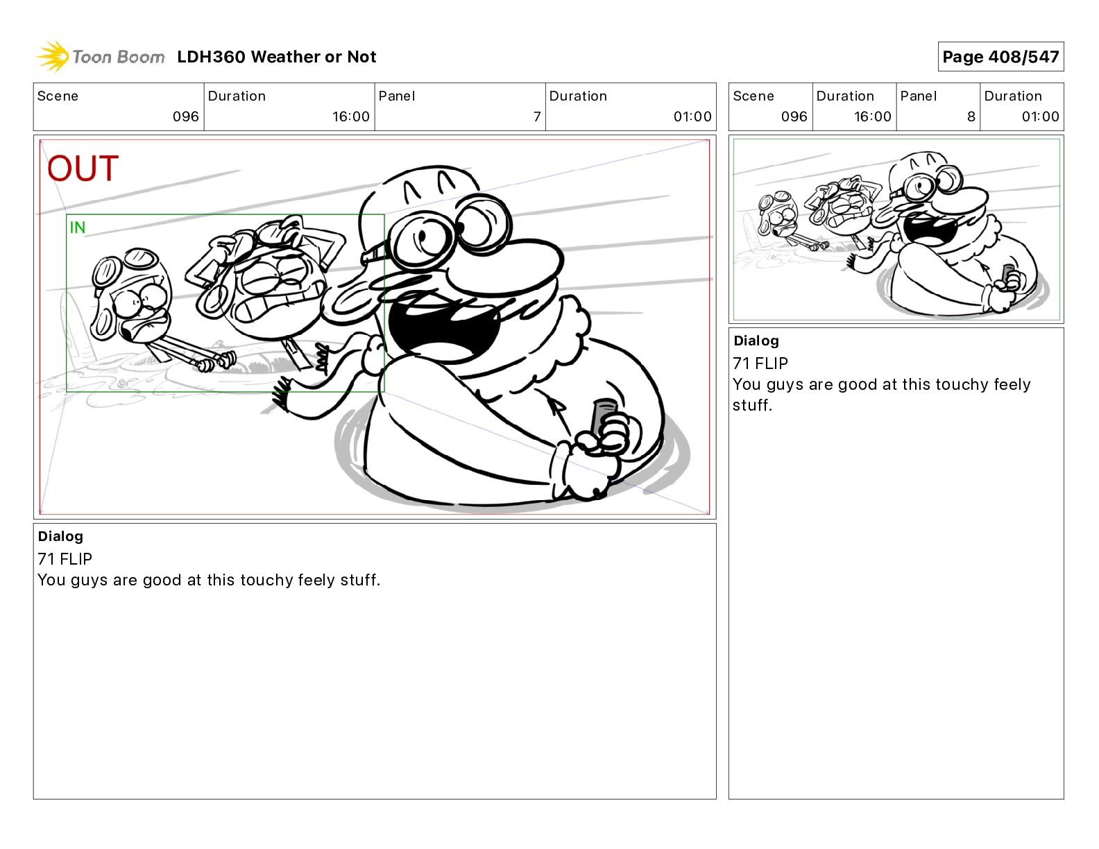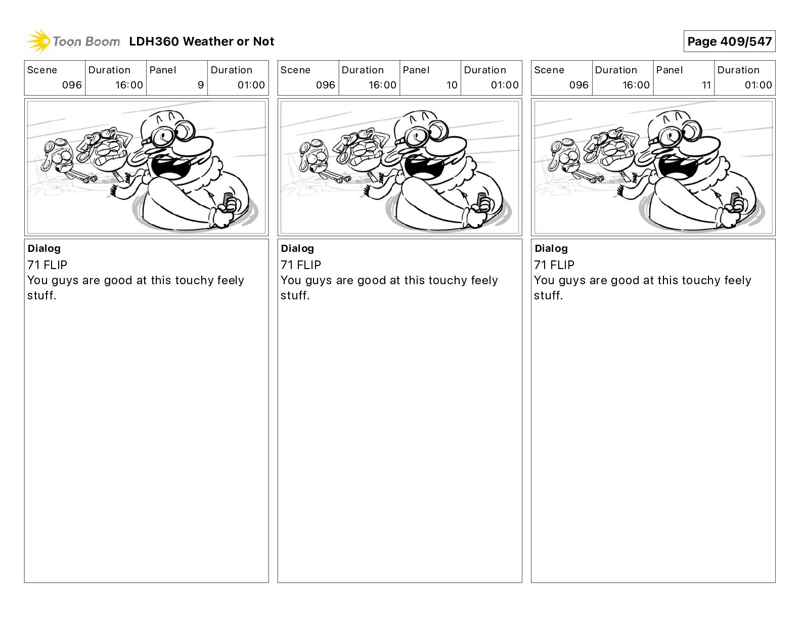 Dialog 71 FLIP You guys are good at this touchy feely stuff. Scene 096 Duration 16 00 Panel 10 Duration 01 00 Dialog 71 FLIP You guys are good at this touchy feely stuff. Scene 096 Duration 16 00 Panel 11 Duration 01 00 Dialog 71 FLIP You guys are good at this touchy feely stuff. LDH360 Weather or Not Page 409/547