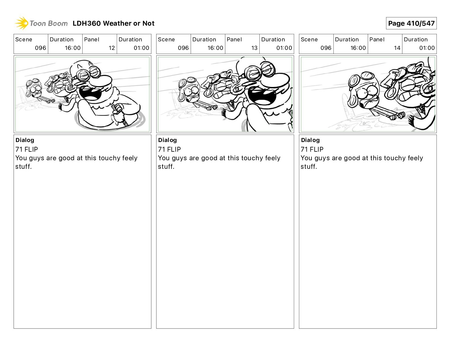 Dialog 71 FLIP You guys are good at this touchy feely stuff. Scene 096 Duration 16 00 Panel 13 Duration 01 00 Dialog 71 FLIP You guys are good at this touchy feely stuff. Scene 096 Duration 16 00 Panel 14 Duration 01 00 Dialog 71 FLIP You guys are good at this touchy feely stuff. LDH360 Weather or Not Page 410/547