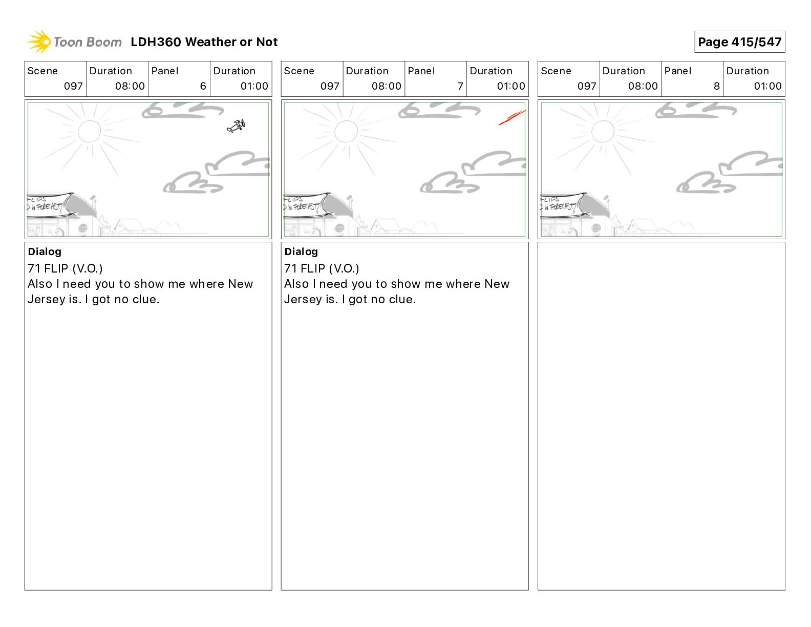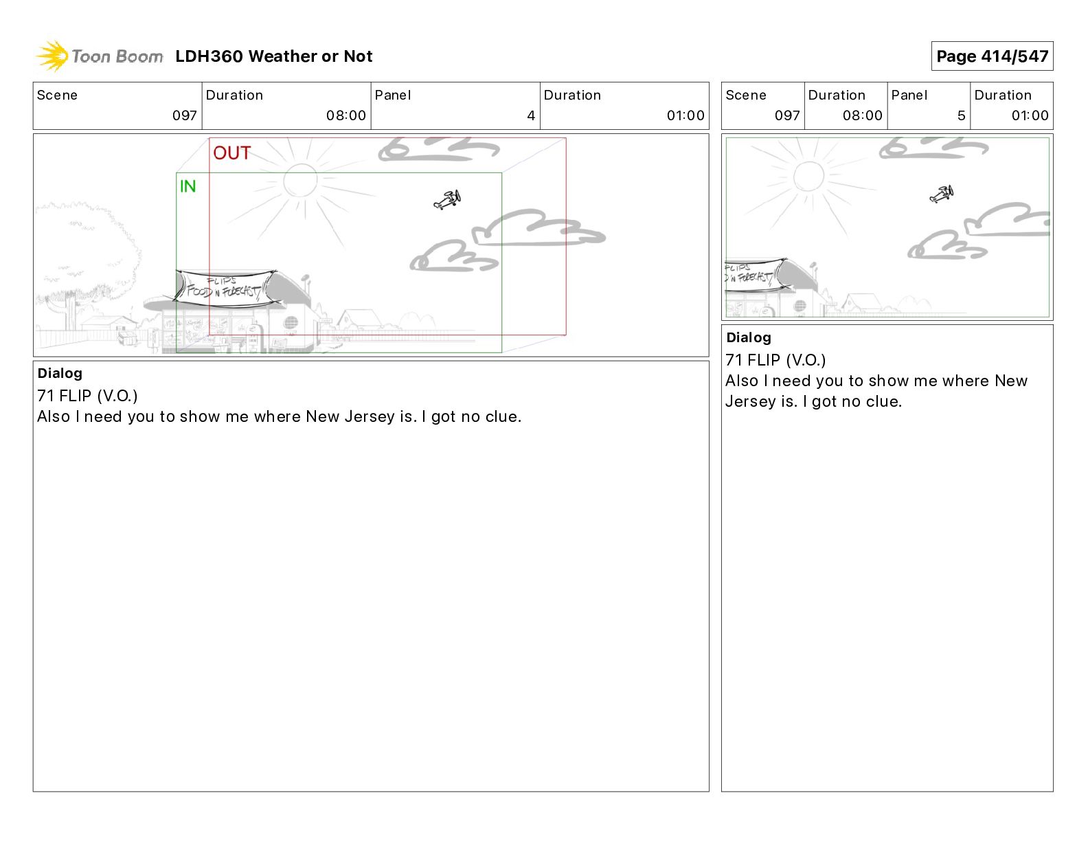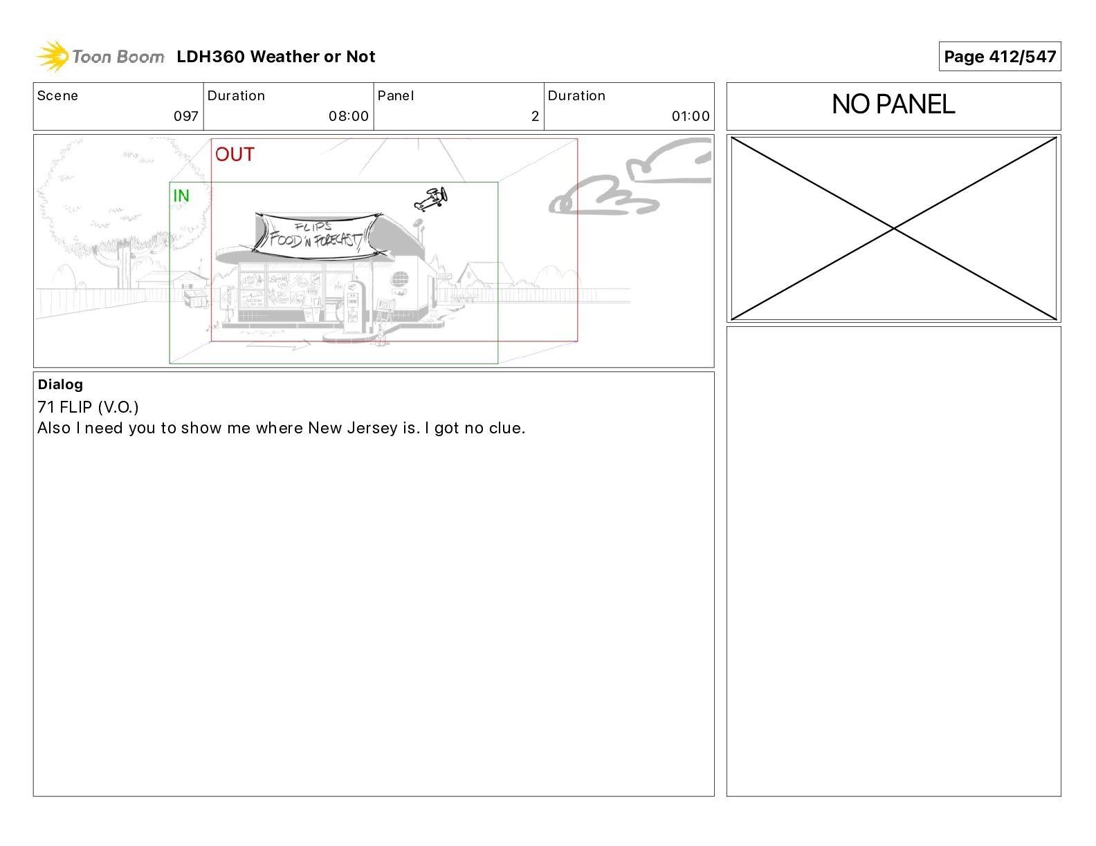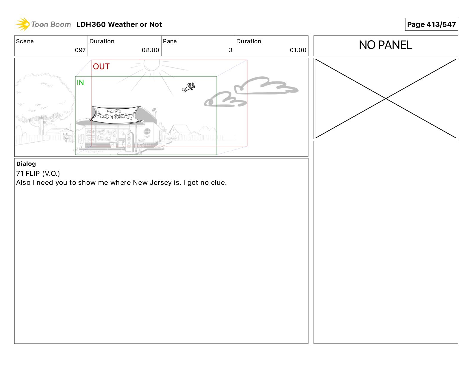 Dialog 71 FLIP (V.O.) Also I need you to show me where New Jersey is. I got no clue. Scene 097 Duration 08 00 Panel 7 Duration 01 00 Dialog 71 FLIP (V.O.) Also I need you to show me where New Jersey is. I got no clue. Scene 097 Duration 08 00 Panel 8 Duration 01 00 LDH360 Weather or Not Page 415/547