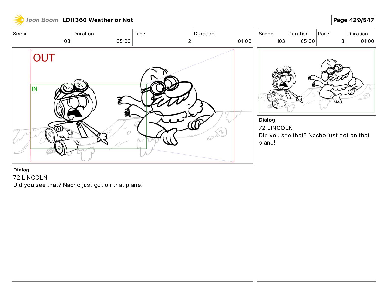 Dialog 72 LINCOLN Did you see that? Nacho just got on that plane! Scene 103 Duration 05 00 Panel 3 Duration 01 00 Dialog 72 LINCOLN Did you see that? Nacho just got on that plane! LDH360 Weather or Not Page 429/547