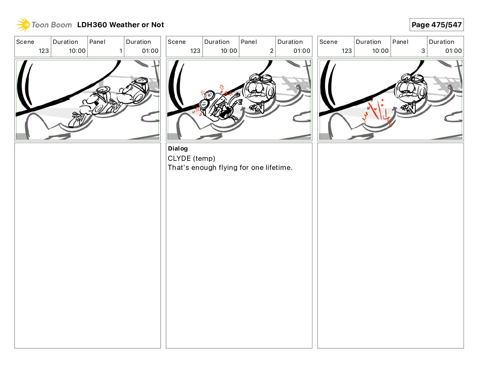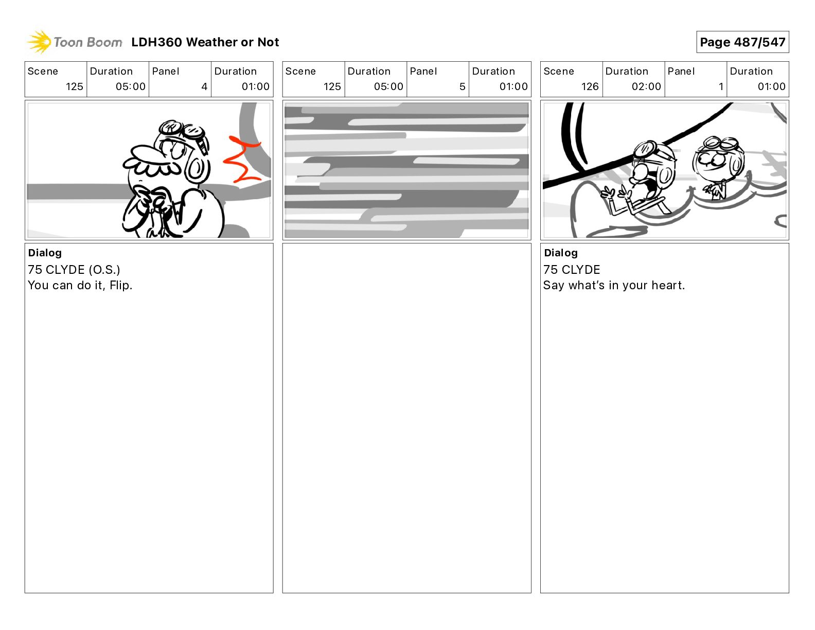 Dialog 75 CLYDE (O.S.) You can do it, Flip. Scene 125 Duration 05 00 Panel 5 Duration 01 00 Scene 126 Duration 02 00 Panel 1 Duration 01 00 Dialog 75 CLYDE Say whatʼs in your heart. LDH360 Weather or Not Page 487/547