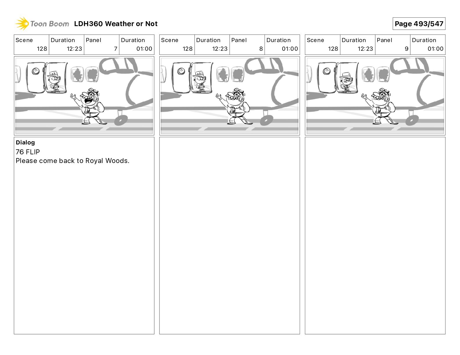 Dialog 76 FLIP Please come back to Royal Woods. Scene 128 Duration 12 23 Panel 8 Duration 01 00 Scene 128 Duration 12 23 Panel 9 Duration 01 00 LDH360 Weather or Not Page 493/547