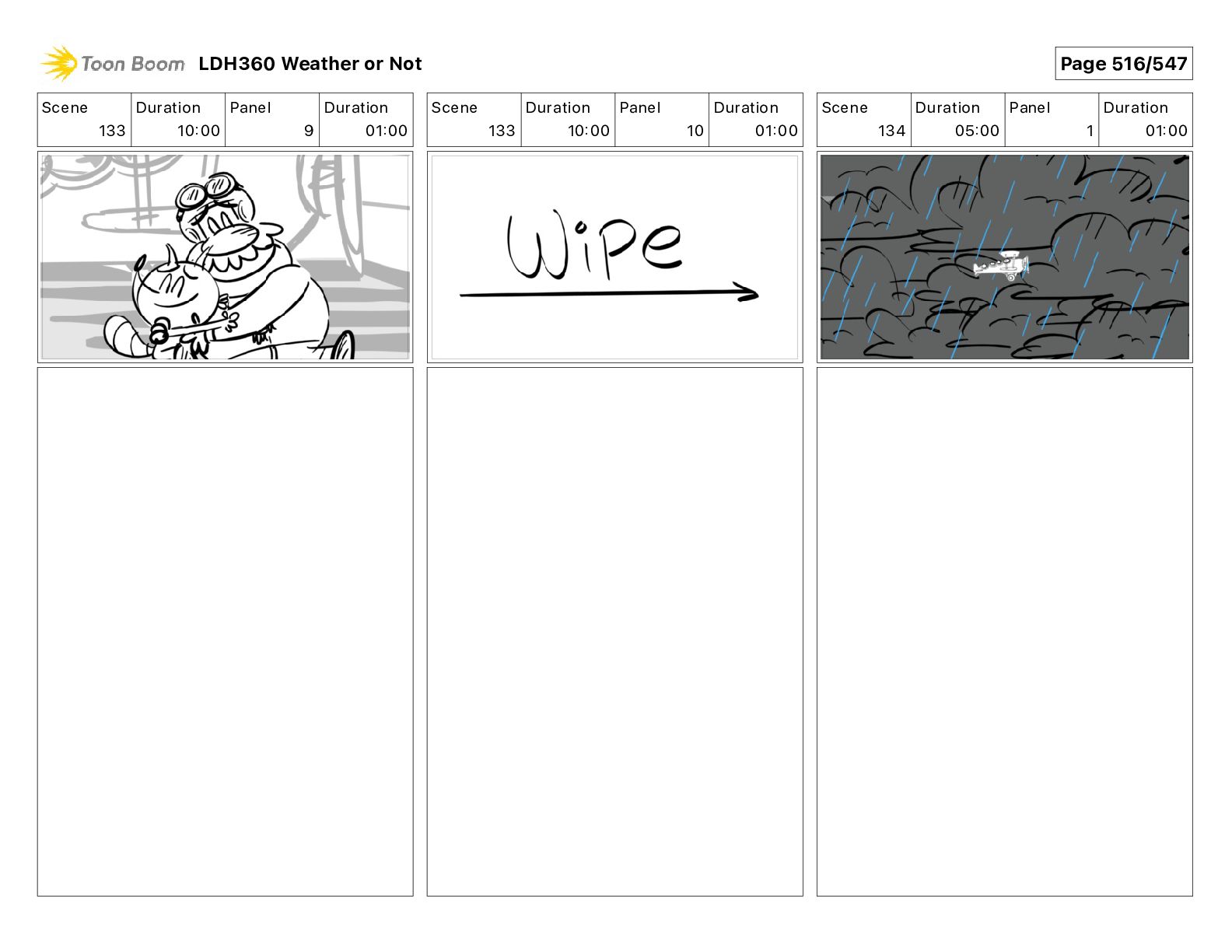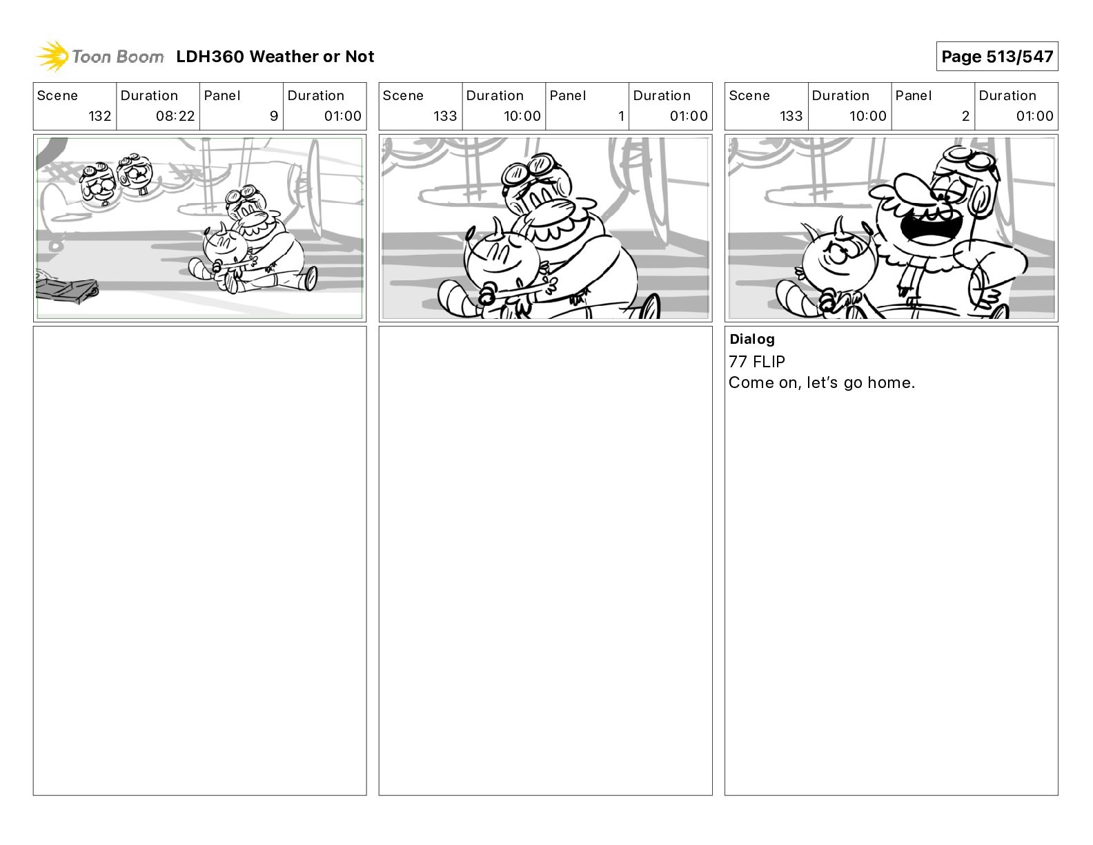 Scene 133 Duration 10 00 Panel 1 Duration 01 00 Scene 133 Duration 10 00 Panel 2 Duration 01 00 Dialog 77 FLIP Come on, letʼs go home. LDH360 Weather or Not Page 513/547