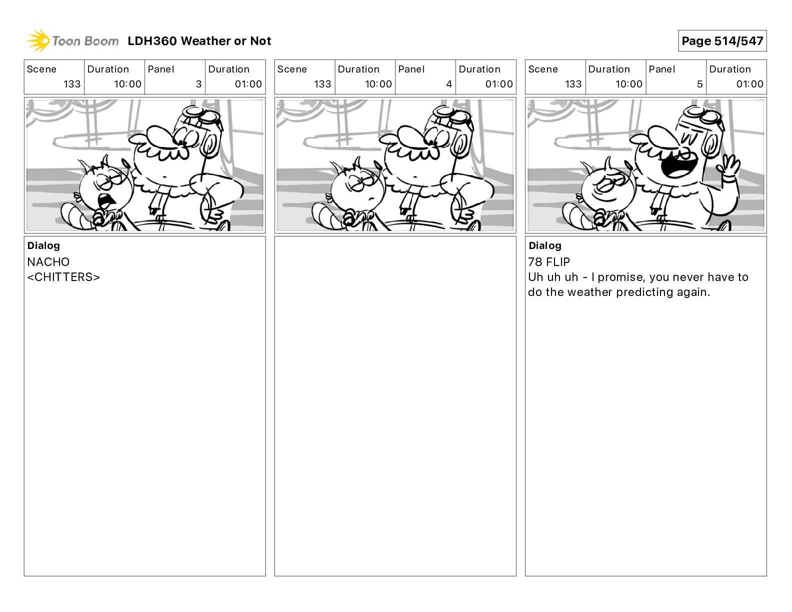 Dialog NACHO <CHITTERS> Scene 133 Duration 10 00 Panel 4 Duration 01 00 Scene 133 Duration 10 00 Panel 5 Duration 01 00 Dialog 78 FLIP Uh uh uh - I promise, you never have to do the weather predicting again. LDH360 Weather or Not Page 514/547
