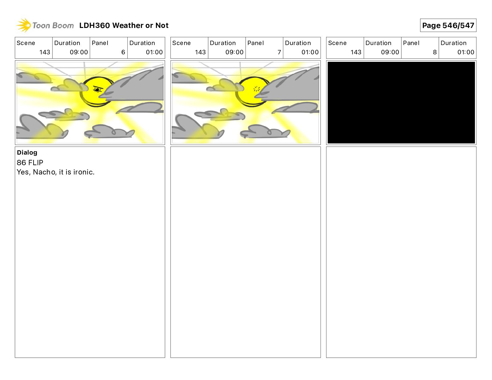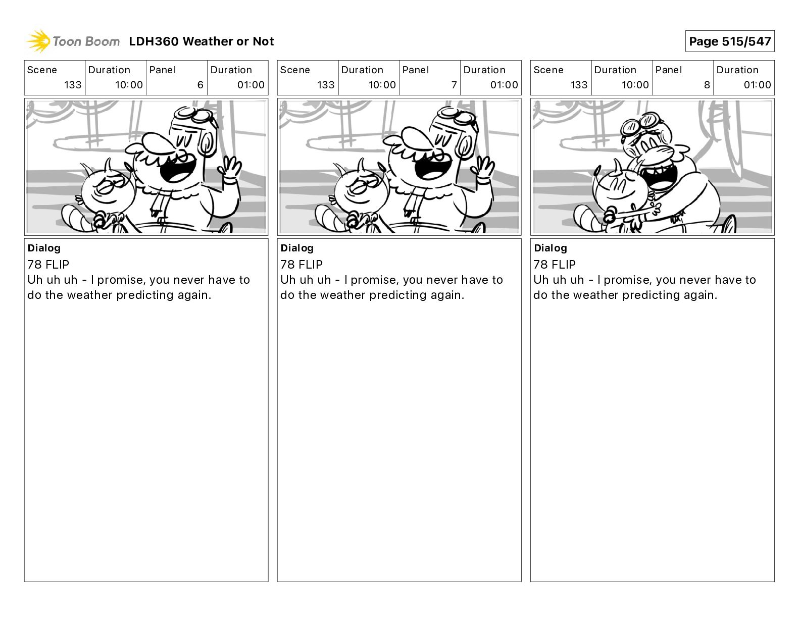 Dialog 78 FLIP Uh uh uh - I promise, you never have to do the weather predicting again. Scene 133 Duration 10 00 Panel 7 Duration 01 00 Dialog 78 FLIP Uh uh uh - I promise, you never have to do the weather predicting again. Scene 133 Duration 10 00 Panel 8 Duration 01 00 Dialog 78 FLIP Uh uh uh - I promise, you never have to do the weather predicting again. LDH360 Weather or Not Page 515/547