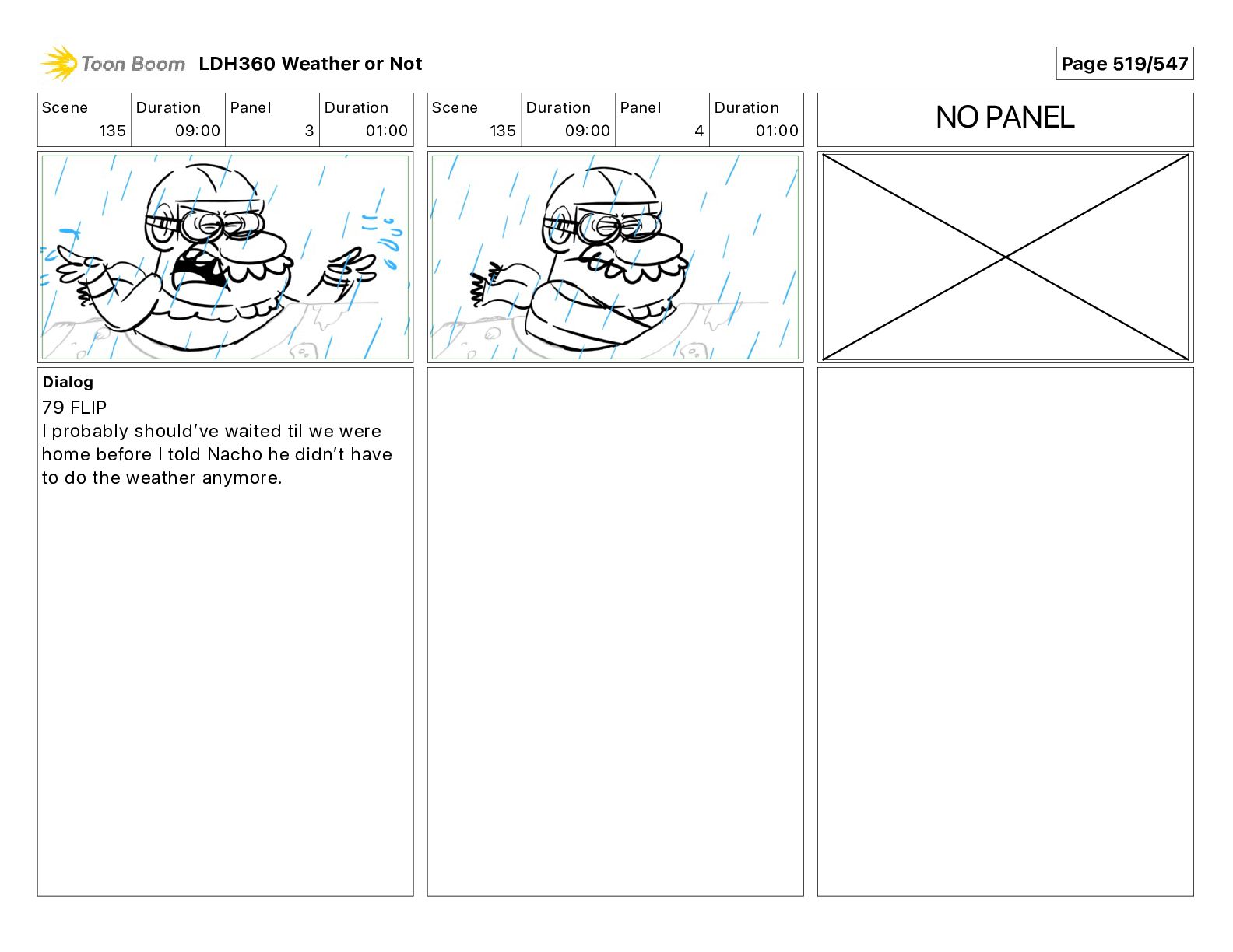 Dialog 79 FLIP I probably shouldʼve waited til we were home before I told Nacho he didnʼt have to do the weather anymore. Scene 135 Duration 09 00 Panel 4 Duration 01 00 NO PANEL LDH360 Weather or Not Page 519/547