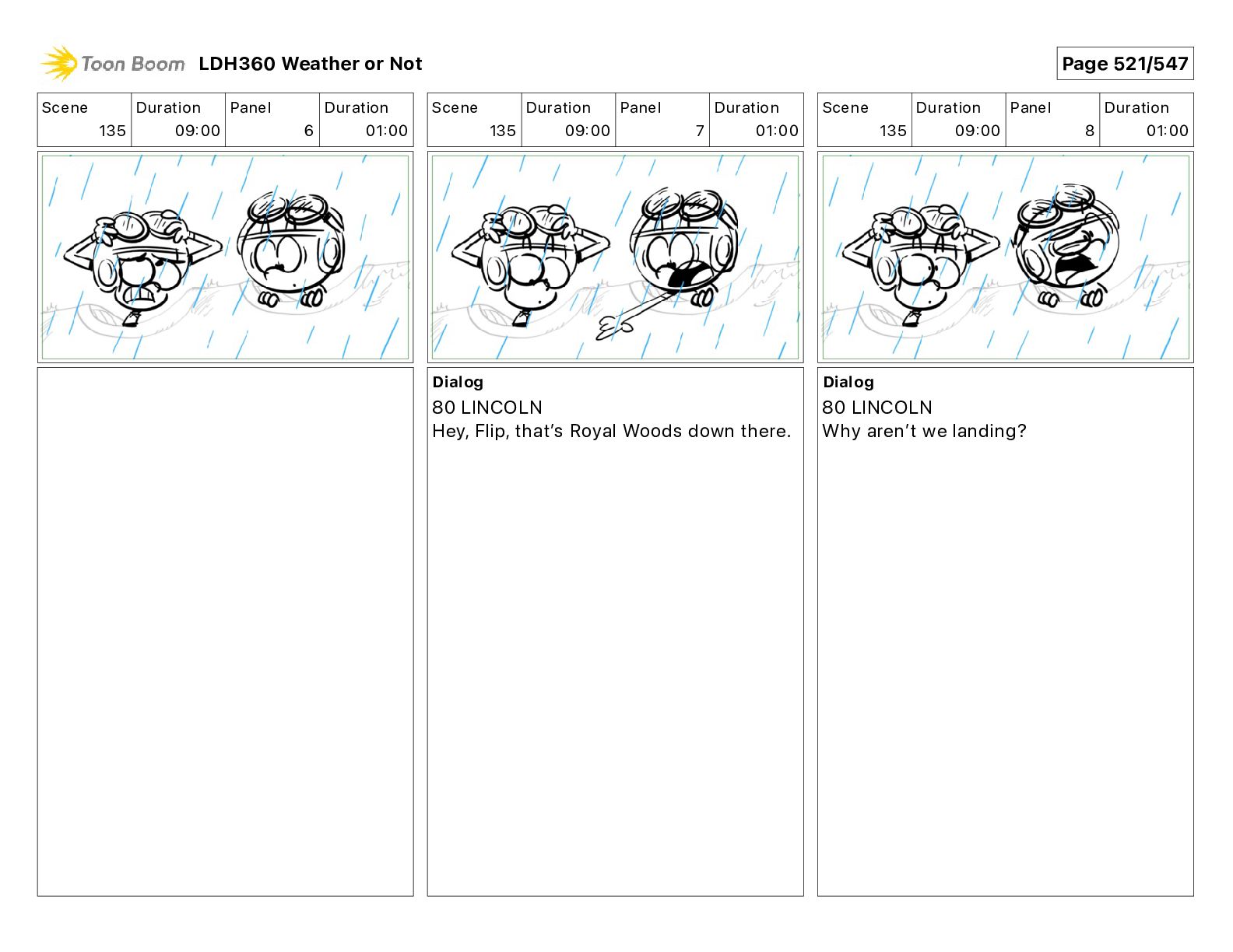 Scene 135 Duration 09 00 Panel 7 Duration 01 00 Dialog 80 LINCOLN Hey, Flip, thatʼs Royal Woods down there. Scene 135 Duration 09 00 Panel 8 Duration 01 00 Dialog 80 LINCOLN Why arenʼt we landing? LDH360 Weather or Not Page 521/547