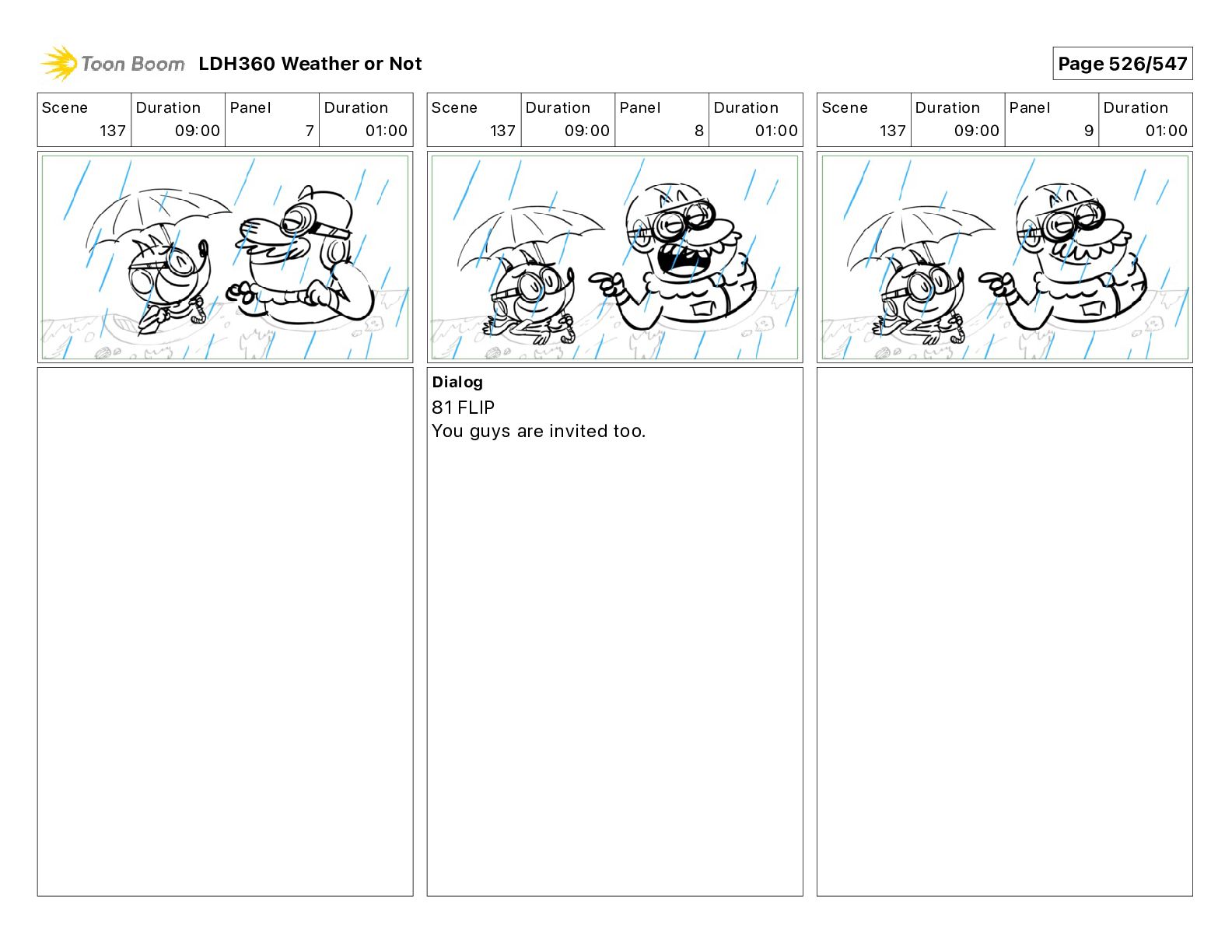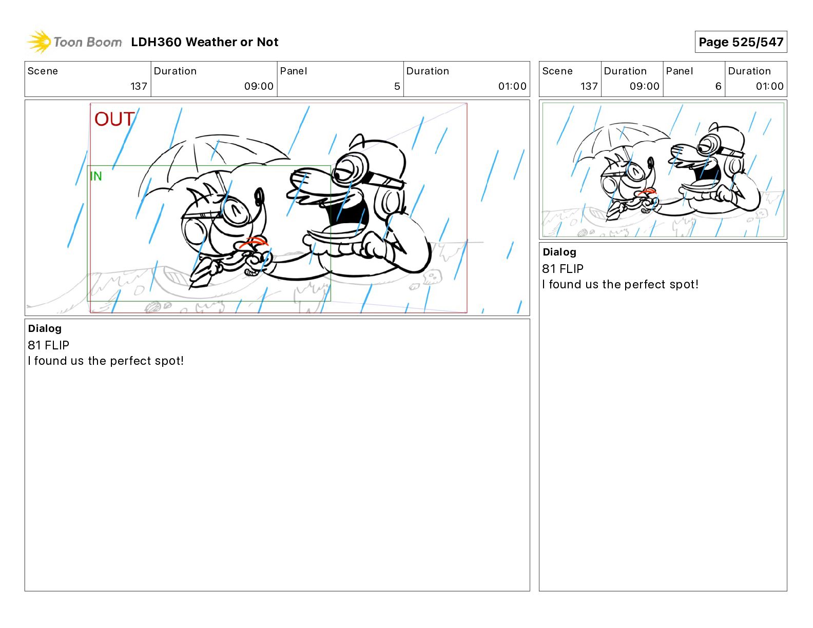 Dialog 81 FLIP I found us the perfect spot! Scene 137 Duration 09 00 Panel 6 Duration 01 00 Dialog 81 FLIP I found us the perfect spot! LDH360 Weather or Not Page 525/547