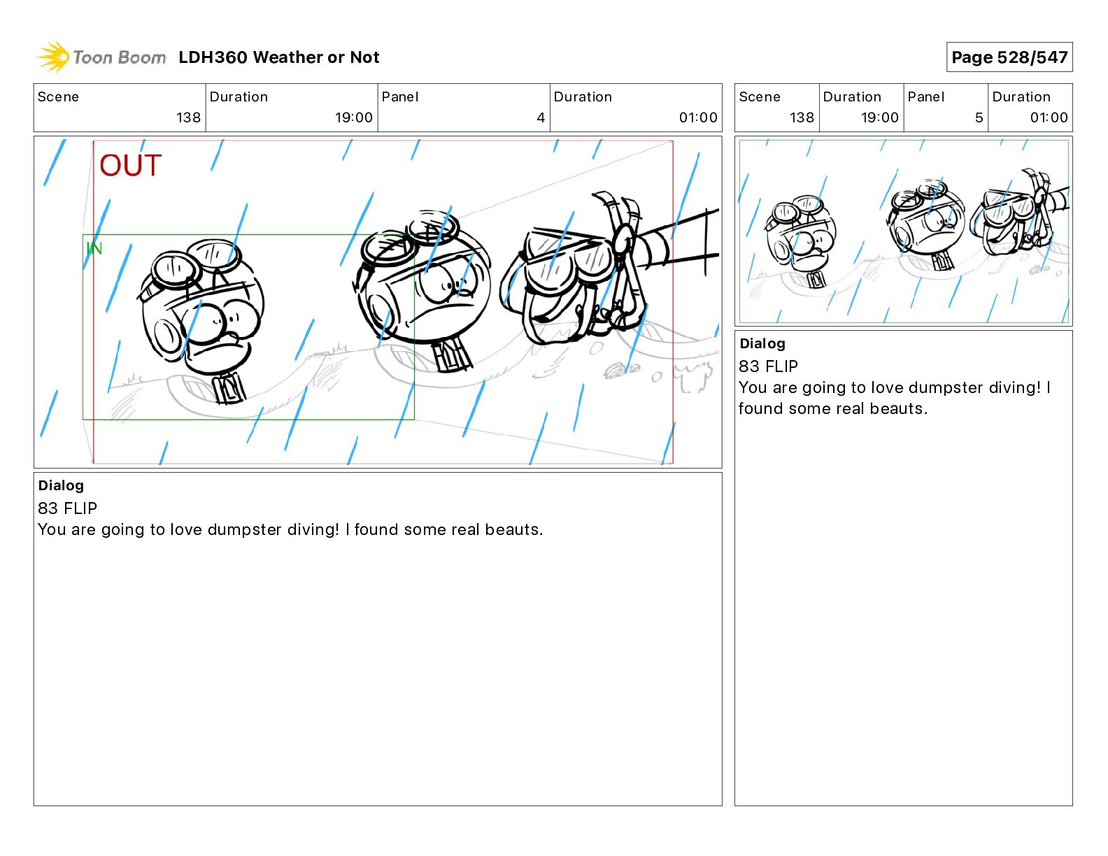 Dialog 83 FLIP You are going to love dumpster diving! I found some real beauts. Scene 138 Duration 19 00 Panel 5 Duration 01 00 Dialog 83 FLIP You are going to love dumpster diving! I found some real beauts. LDH360 Weather or Not Page 528/547
