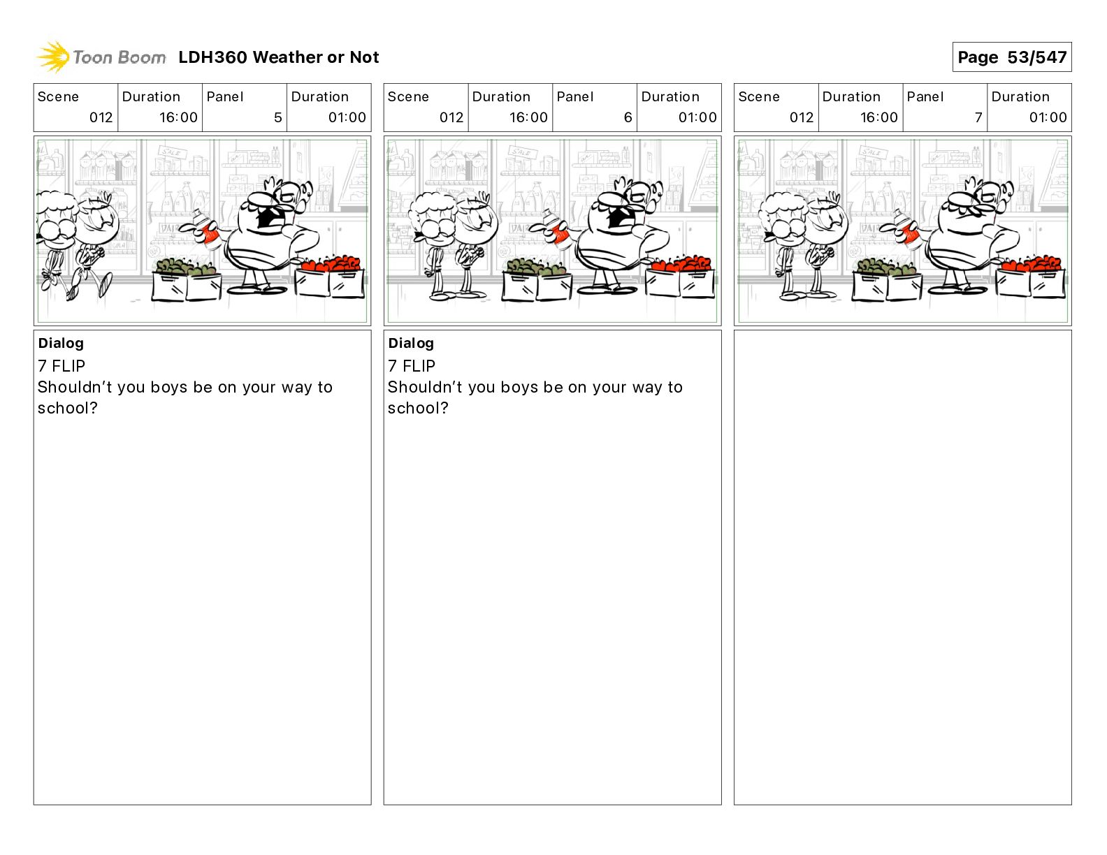 Dialog 7 FLIP Shouldnʼt you boys be on your way to school? Scene 012 Duration 16 00 Panel 6 Duration 01 00 Dialog 7 FLIP Shouldnʼt you boys be on your way to school? Scene 012 Duration 16 00 Panel 7 Duration 01 00 LDH360 Weather or Not Page 53/547