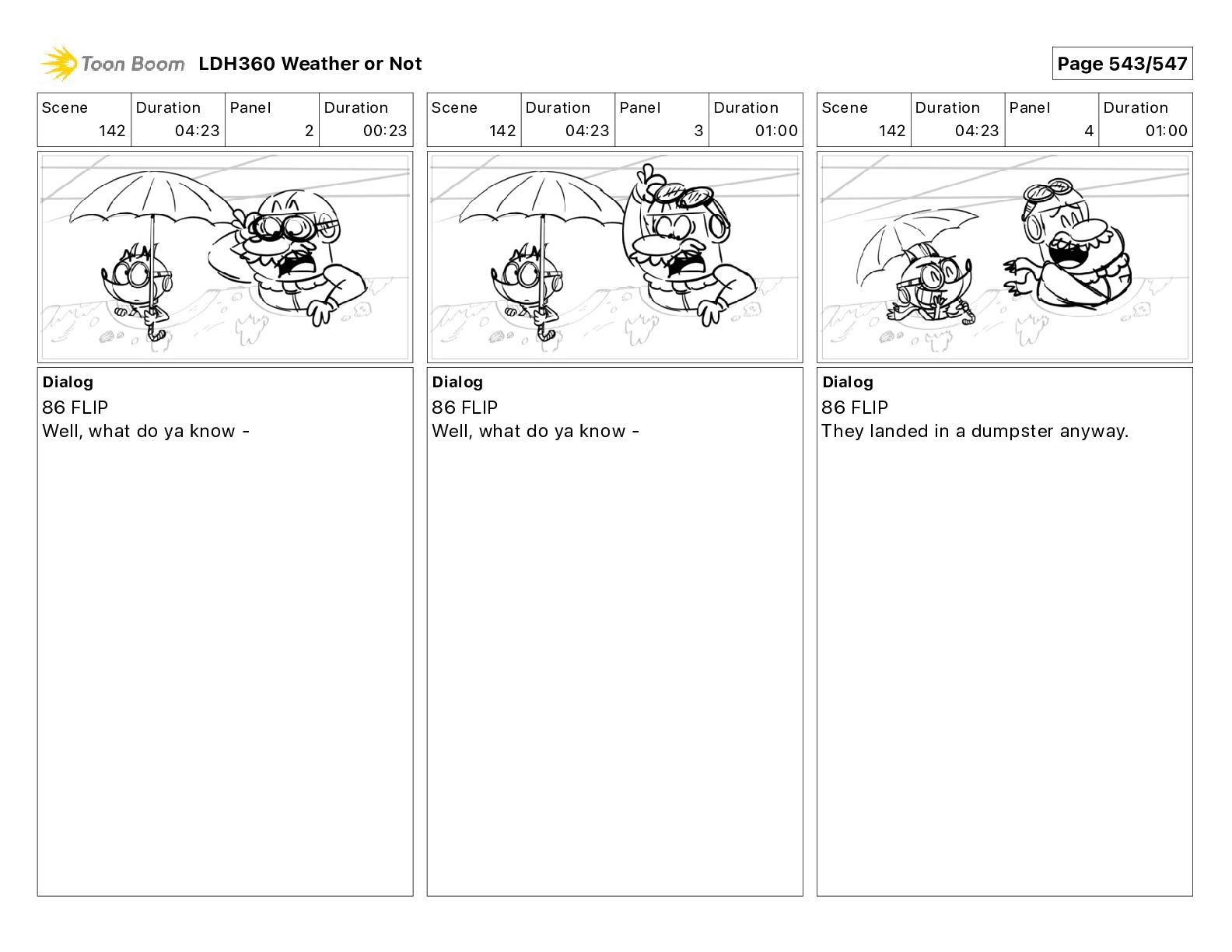 Dialog 86 FLIP Well, what do ya know - Scene 142 Duration 04 23 Panel 3 Duration 01 00 Dialog 86 FLIP Well, what do ya know - Scene 142 Duration 04 23 Panel 4 Duration 01 00 Dialog 86 FLIP They landed in a dumpster anyway. LDH360 Weather or Not Page 543/547