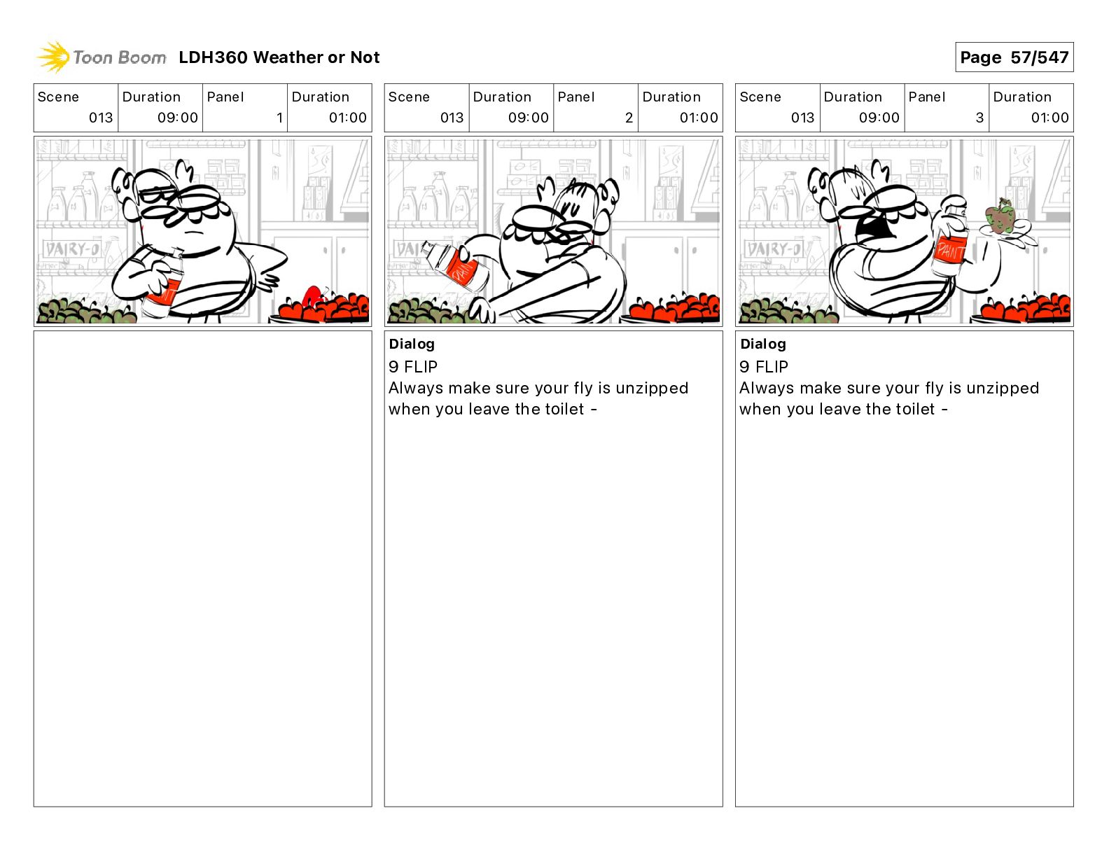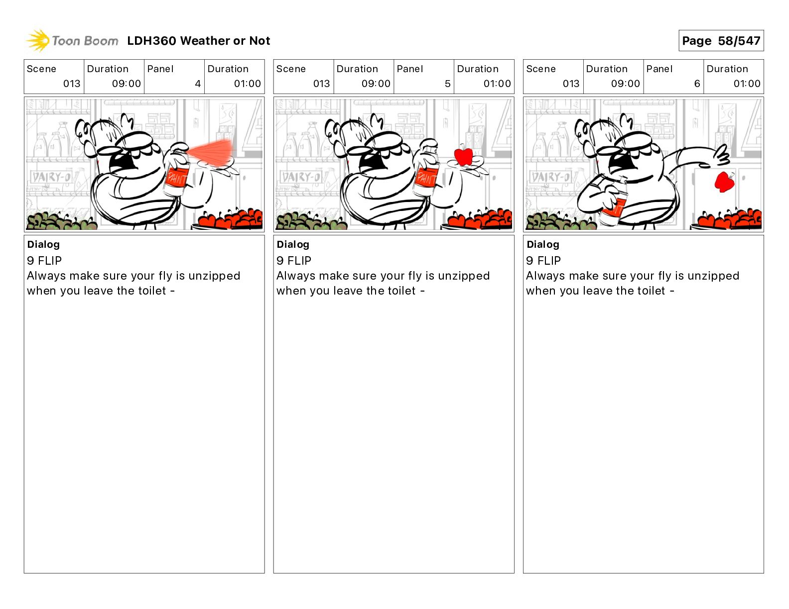 Dialog 9 FLIP Always make sure your fly is unzipped when you leave the toilet - Scene 013 Duration 09 00 Panel 5 Duration 01 00 Dialog 9 FLIP Always make sure your fly is unzipped when you leave the toilet - Scene 013 Duration 09 00 Panel 6 Duration 01 00 Dialog 9 FLIP Always make sure your fly is unzipped when you leave the toilet - LDH360 Weather or Not Page 58/547