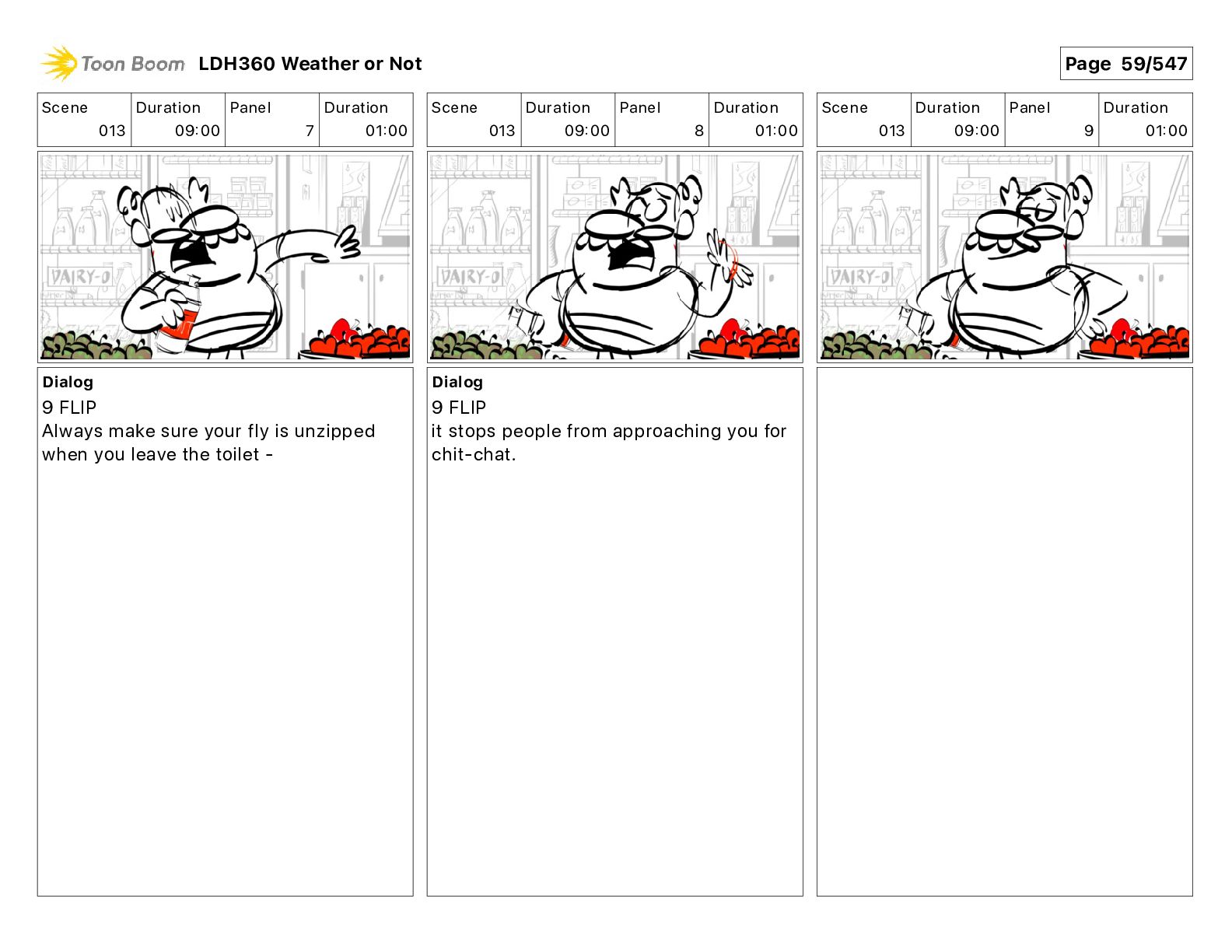 Dialog 9 FLIP Always make sure your fly is unzipped when you leave the toilet - Scene 013 Duration 09 00 Panel 8 Duration 01 00 Dialog 9 FLIP it stops people from approaching you for chit-chat. Scene 013 Duration 09 00 Panel 9 Duration 01 00 LDH360 Weather or Not Page 59/547
