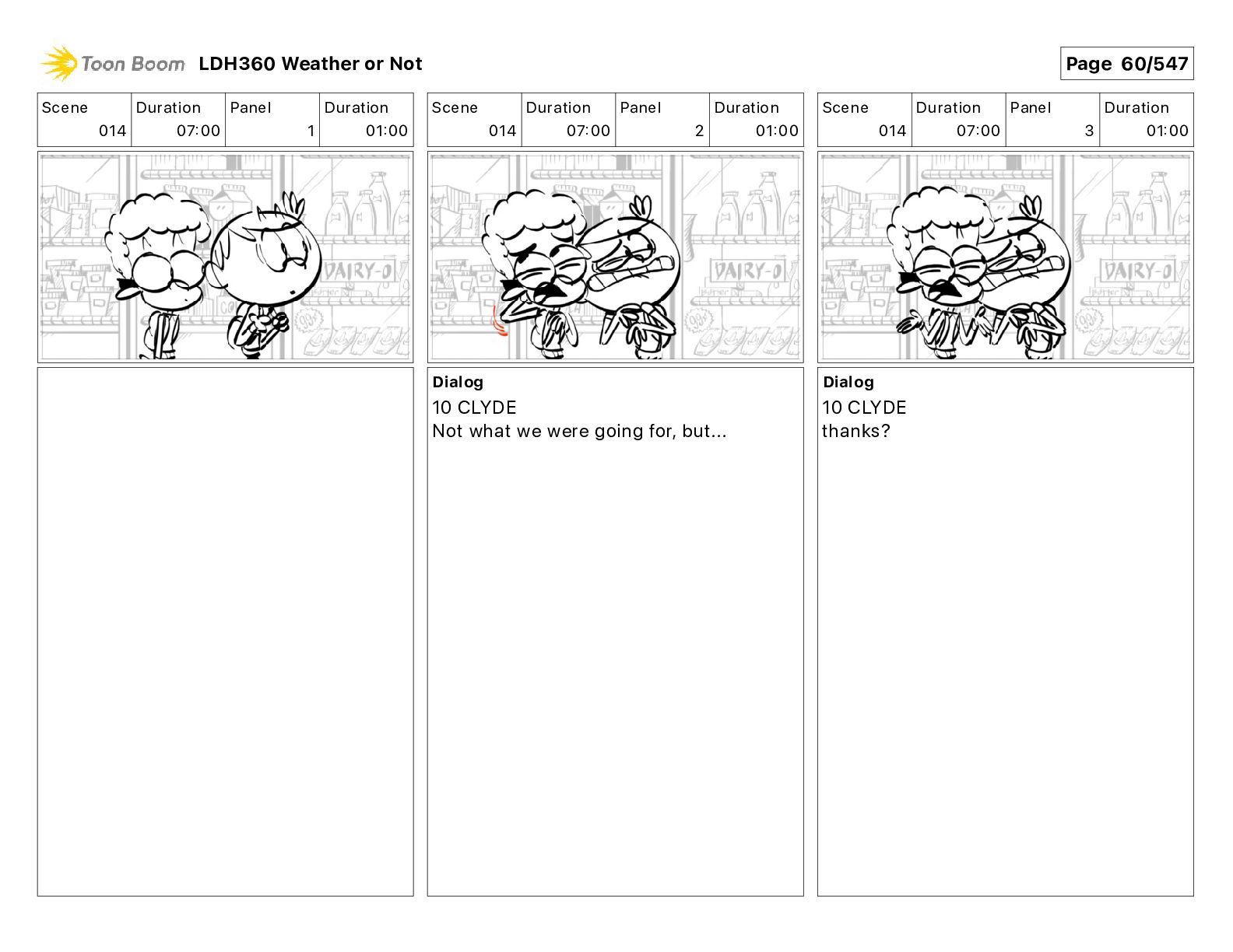 Scene 014 Duration 07 00 Panel 2 Duration 01 00 Dialog 10 CLYDE Not what we were going for, but... Scene 014 Duration 07 00 Panel 3 Duration 01 00 Dialog 10 CLYDE thanks? LDH360 Weather or Not Page 60/547