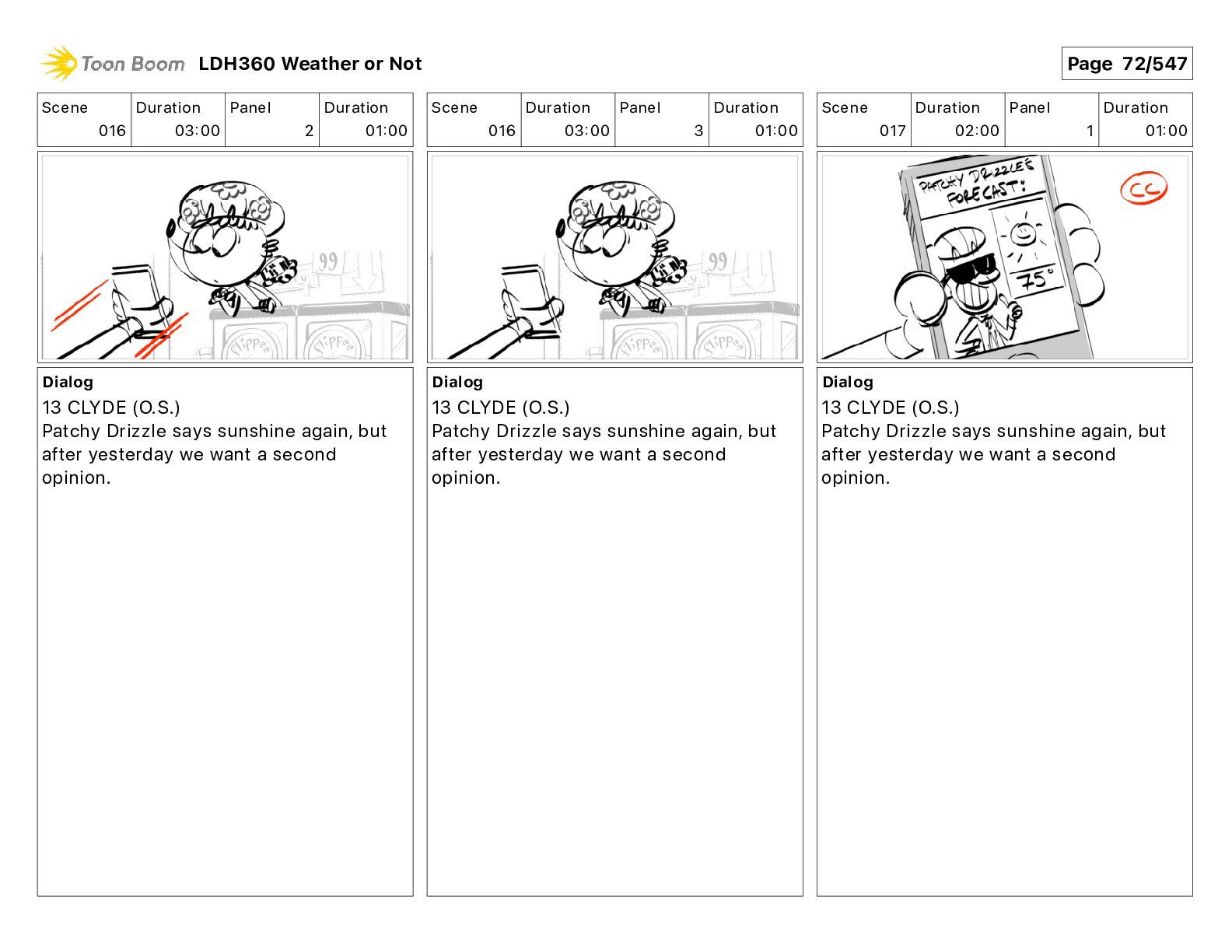 Dialog 13 CLYDE (O.S.) Patchy Drizzle says sunshine again, but after yesterday we want a second opinion. Scene 016 Duration 03 00 Panel 3 Duration 01 00 Dialog 13 CLYDE (O.S.) Patchy Drizzle says sunshine again, but after yesterday we want a second opinion. Scene 017 Duration 02 00 Panel 1 Duration 01 00 Dialog 13 CLYDE (O.S.) Patchy Drizzle says sunshine again, but after yesterday we want a second opinion. LDH360 Weather or Not Page 72/547